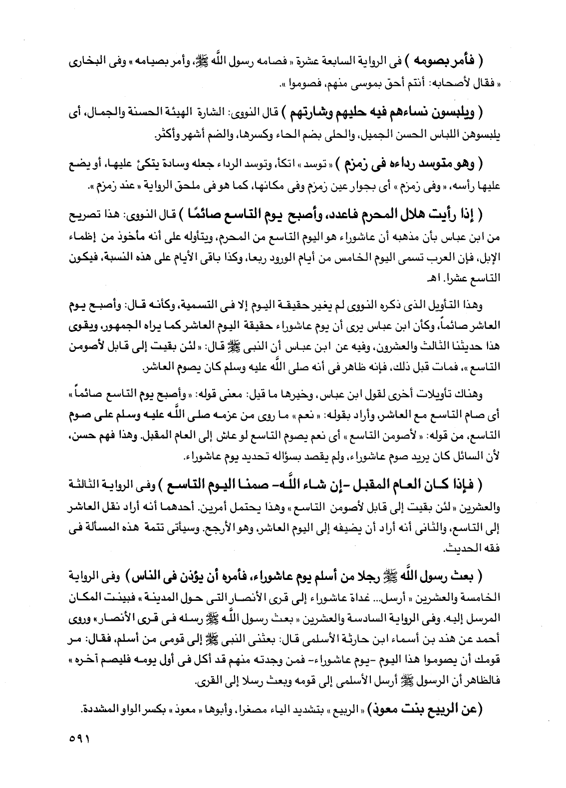 (إذا رأيت هلال المحرم فاعدد، وأصبح يوم التاسع صائماً) قال النووي: هذا تصريح من ابن عباس بأن مذهبه أن عاشوراء هو اليوم التاسع من المحرم، ويتأوله على أنه مأخوذ من إظماء الإبل، فإن العرب تسمي اليوم الخامس من أيام الورود ربعاً، وكذا باقي الأيام على هذه النسبة، فيكون التاسع عشراً. اهـ.