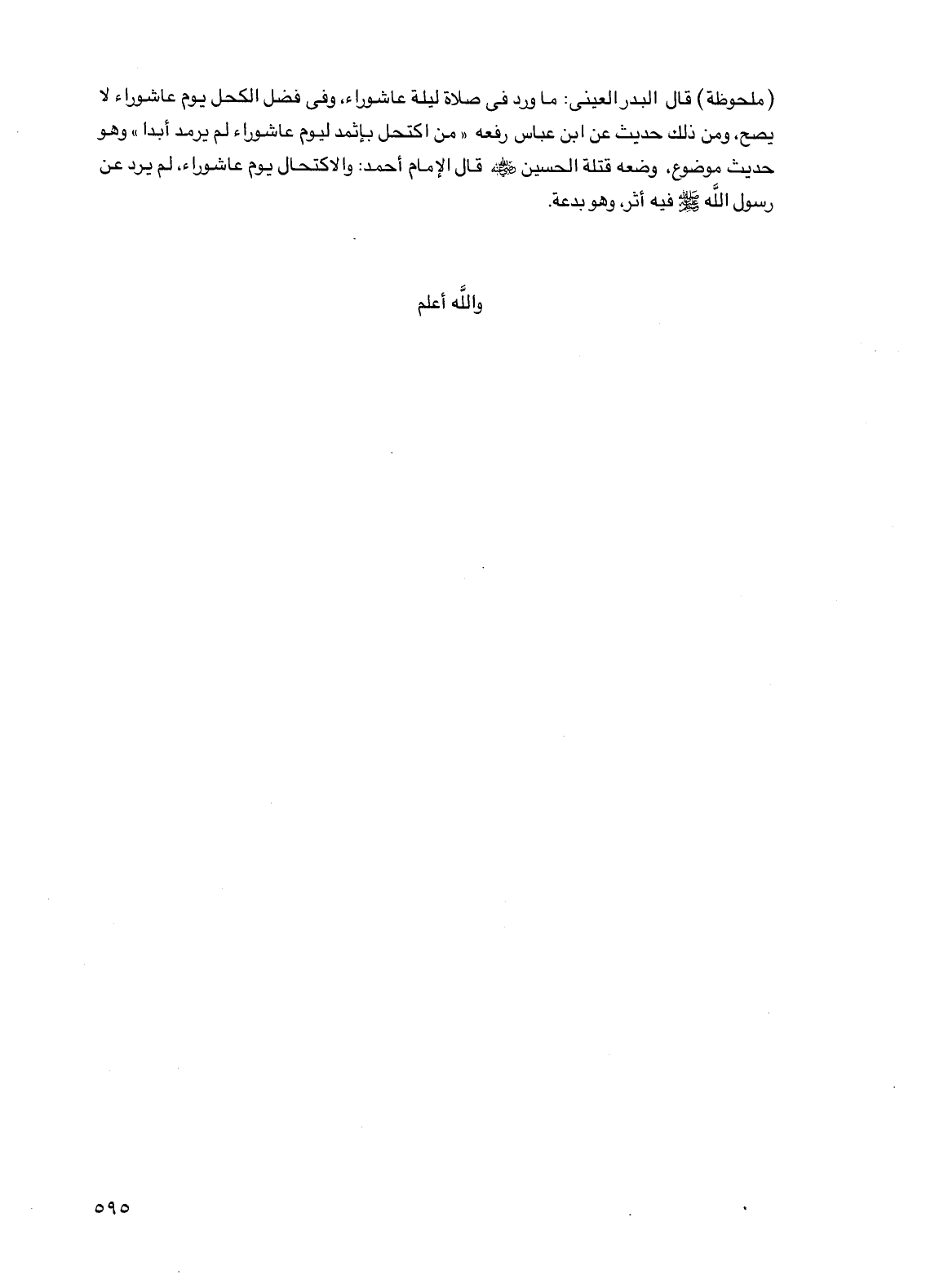 (ملحوظة) قال البدر العيني: ما ورد في صلاة ليلة عاشوراء، وفي فضل الكحل يوم عاشوراء لا يصح، ومن ذلك حديث عن ابن عباس رفعه "من اكتحل بإثمد ليوم عاشوراء لم يرمد أبداً" وهو حديث موضوع، وضعه قتلة الحسين رضي الله عنه قال الإمام أحمد: والاكتحال يوم عاشوراء، لم يرد عن رسول الله صلى الله عليه وسلم فيه أثر، وهو بدعة.