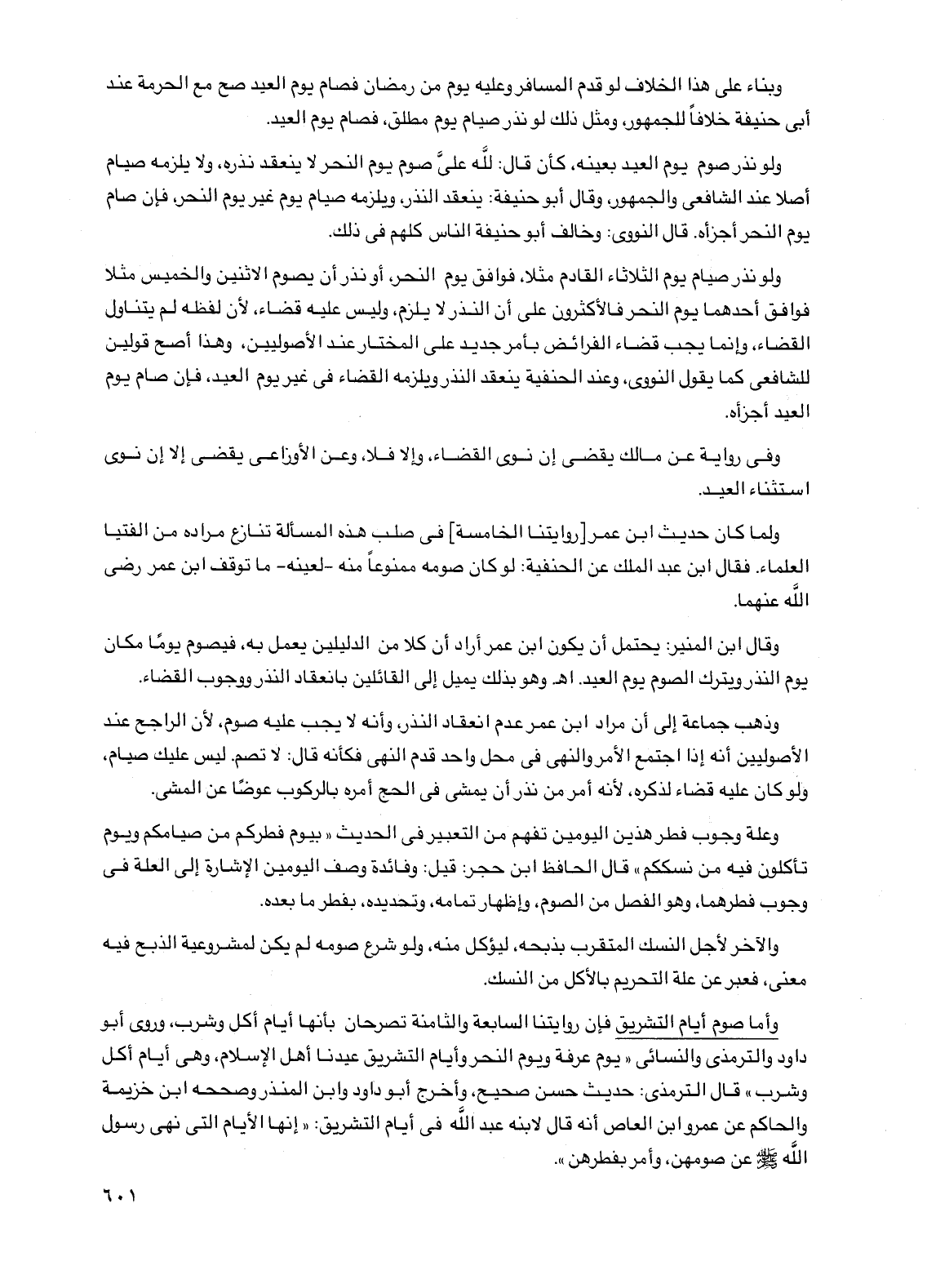 ولو نذر صوم يوم العيد بعينه، كأنه قال: لله علي صوم يوم النحر لا ينعقد نذره، ولا يلزمه صيام أصلاً عند الشافعي والجمهور، وقال أبو حنيفة: ينعقد النذر، ويلزمه صيام يوم غير يوم النحر، فإن صام يوم النحر أجزأه. قال النووي: وخالف أبو حنيفة الناس كلهم في ذلك.