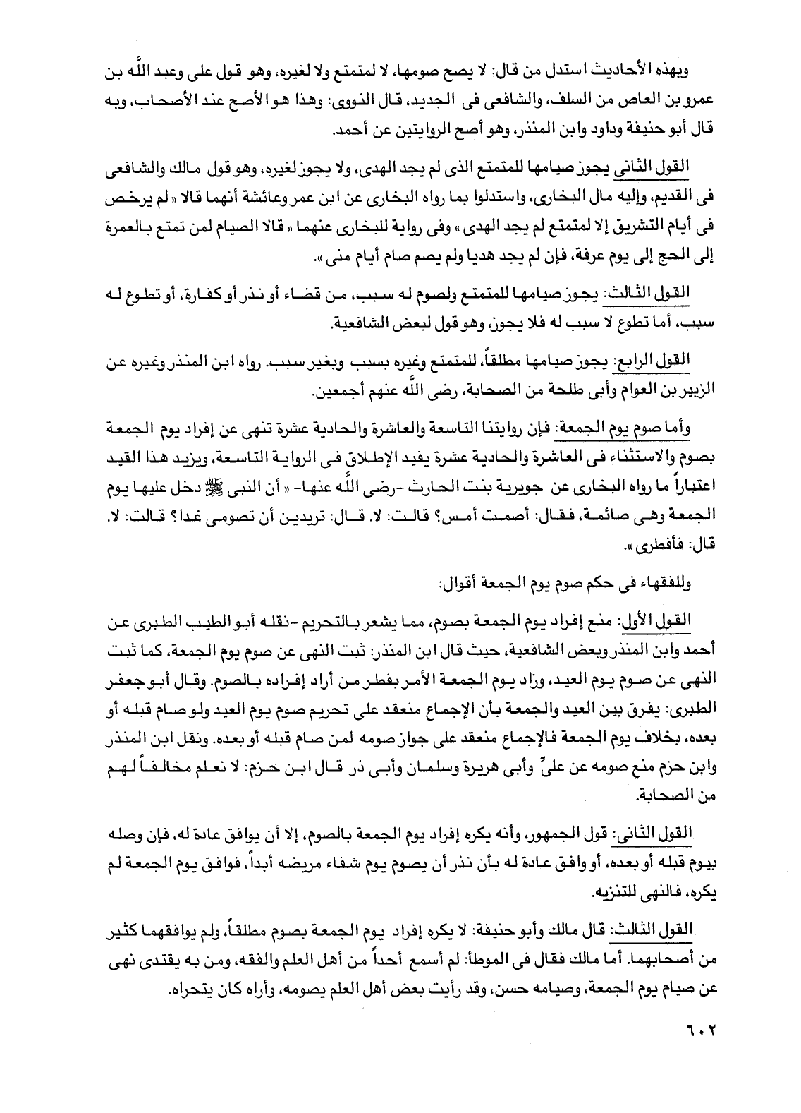 القول الأول: منع إفراد يوم الجمعة بصوم، مما يشعر بالتحريم -نقله أبو الطيب الطبري عن أحمد وابن المنذر وبعض الشافعية، حيث قال ابن المنذر: ثبت النهي عن صوم يوم الجمعة، كما ثبت النهي عن صوم يوم العيد، وزاد يوم الجمعة الأمر بفطر من أراد إفراده بالصوم. وقال أبو جعفر الطبري: يفرق بين العيد والجمعة بأن الإجماع منعقد على تحريم صوم يوم العيد ولو صام قبله أو بعده، بخلاف يوم الجمعة فالإجماع منعقد على جواز صومه لمن صام قبله أو بعده. ونقل ابن المنذر وابن حزم منع صومه عن علي وأبي هريرة وسلمان وأبي ذر قال ابن حزم: لا نعلم مخالفاً لهم من الصحابة.