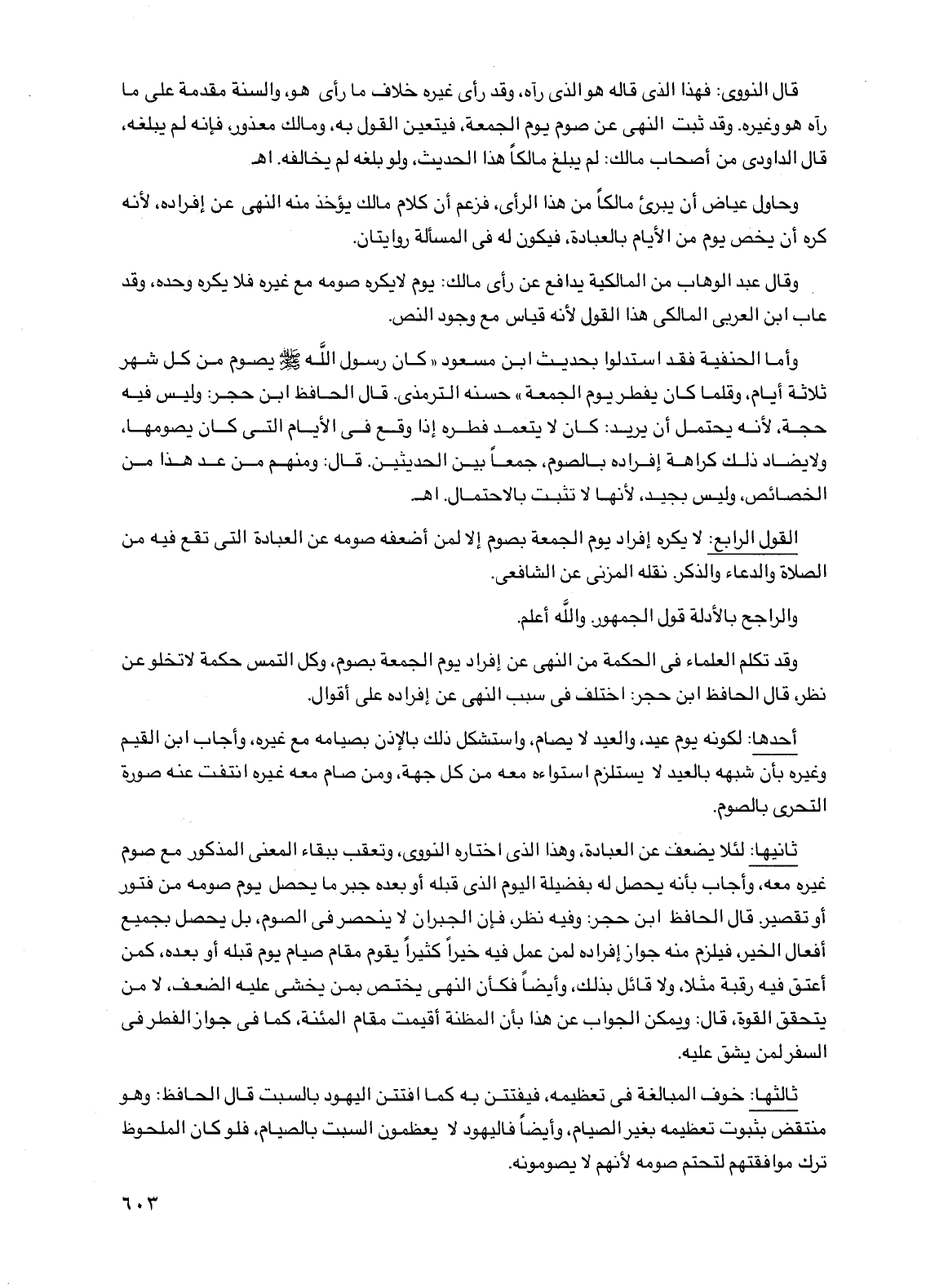 ثانيها: لئلا يضعف عن العبادة، وهذا الذي اختاره النووي، وتعقب ببقاء المعنى المذكور مع صوم غيره معه، وأجاب بأنه يحصل له بفضيلة اليوم الذي قبله أو بعده جبر ما يحصل يوم صومه من فتور أو تقصير. قال الحافظ ابن حجر: وفيه نظر، فإن الجبران لا ينحصر في الصوم، بل يحصل بجميع أفعال الخير، فيلزم منه جواز إفراده لمن عمل فيه خيراً كثيراً يقوم مقام صيام يوم قبله أو بعده، كمن أعتق فيه رقبة مثلاً، ولا قائل بذلك، وأيضاً فكأن النهي يختص بمن يخشى عليه الضعف، لا من يتحقق القوة، قال: ويمكن الجواب عن هذا بأن المظنة أقيمت مقام المئنة، كما في جواز الفطر في السفر لمن يشق عليه.