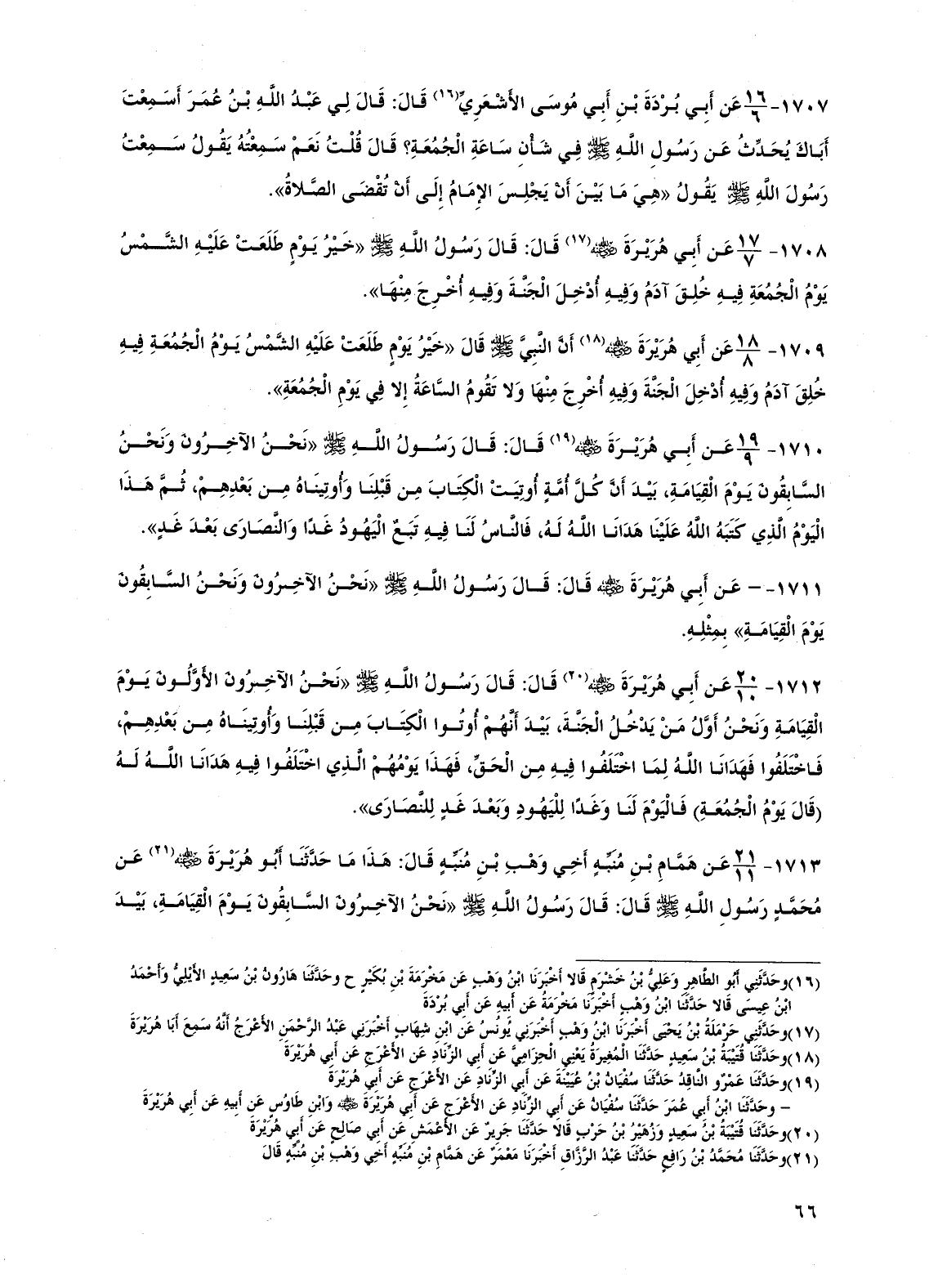 1712 - عن أبي هريرة رضي الله عنه قال: قال رسول الله صلى الله عليه وسلم "نحن الآخرون الأولون يوم القيامة ونحن أول من يدخل الجنة، بيد أنهم أوتوا الكتاب من قبلنا وأوتيناه من بعدهم، فاختلفوا فهدانا الله لما اختلفوا فيه من الحق، فهذا يومهم الذي اختلفوا فيه هدانا الله له (قال يوم الجمعة) فاليوم لنا وغداً لليهود وبعد غد للنصارى".
