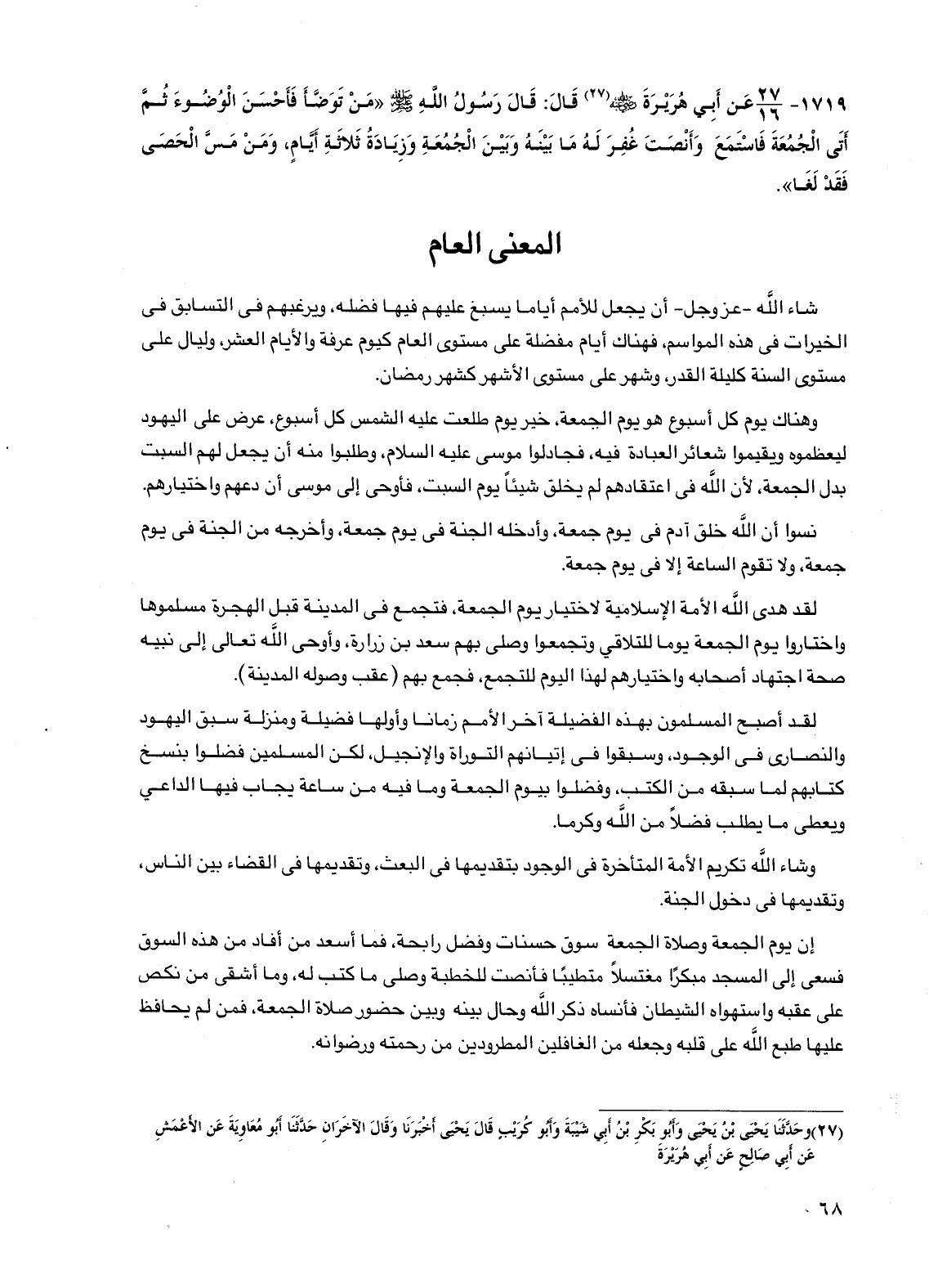1719 - عن أبي هريرة رضي الله عنه قال: قال رسول الله صلى الله عليه وسلم "من توضأ فأحسن الوضوء ثم أتى الجمعة فاستمع وأنصت غفر له ما بينه وبين الجمعة وزيادة ثلاثة أيام، ومن مس الحصى فقد لغا".