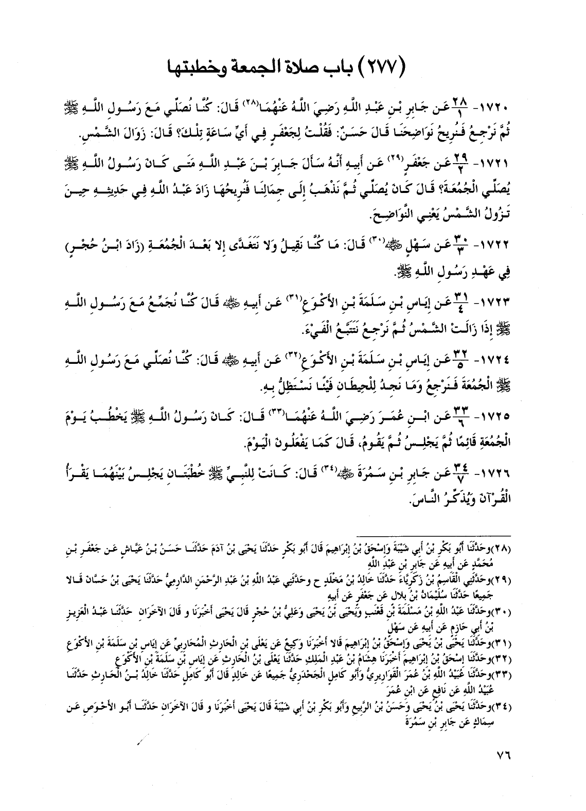 1720 - عن جابر بن عبد الله رضي الله عنهما قال: كنا نصلي مع رسول الله صلى الله عليه وسلم ثم نرجع فنريح نواضحنا قال حسن: فقلت لجعفر في أي ساعة تلك؟ قال: زوال الشمس.