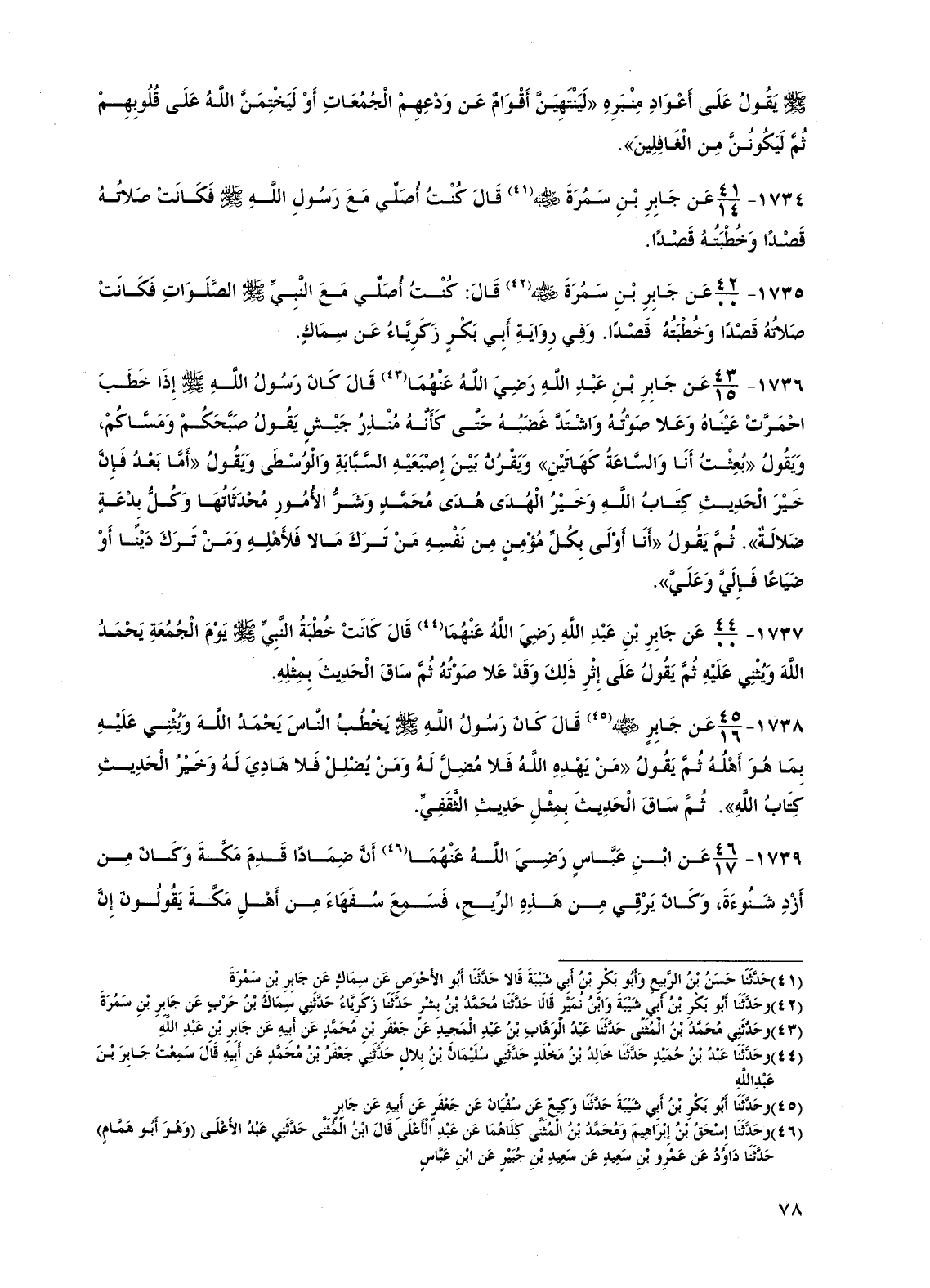 1737 - عن جابر بن عبد الله رضي الله عنهما قال كانت خطبة النبي صلى الله عليه وسلم يوم الجمعة يحمد الله ويثني عليه ثم يقول على إثر ذلك وقد علا صوته ثم ساق الحديث بمثله.