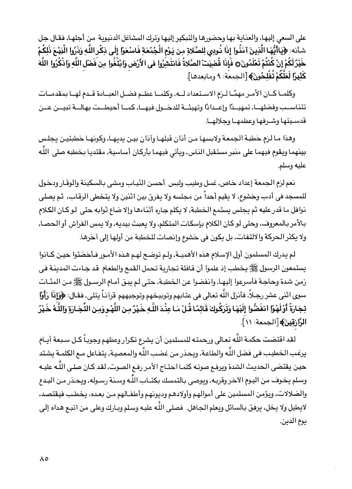 على السعي إليها، والعناية بها وحضورها والتبكير إليها وترك المشاغل الدنيوية من أجلها، فقال جل شأنه: {يا أيها الذين آمنوا إذا نودي للصلاة من يوم الجمعة فاسعوا إلى ذكر الله وذروا البيع ذلكم خير لكم إن كنتم تعلمون فإذا قضيت الصلاة فانتشروا في الأرض وابتغوا من فضل الله واذكروا الله كثيراً لعلكم تفلحون} [الجمعة: 9 وما بعدها].
