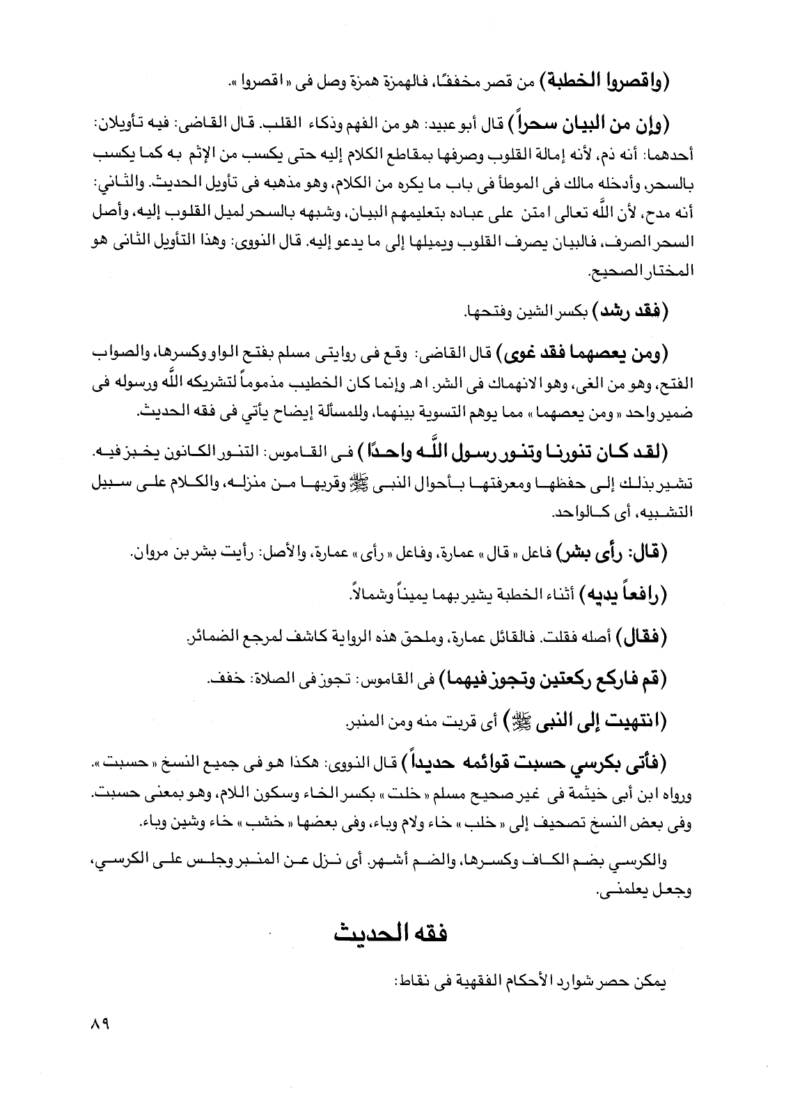 (وإن من البيان سحراً) قال أبو عبيد: هو من الفهم وذكاء القلب. قال القاضي: فيه تأويلان: أحدهما: أنه ذم، لأنه إمالة القلوب وصرفها بمقاطع الكلام إليه حتى يكسب من الإثم به كما يكسب بالسحر، وأدخله مالك في الموطأ في باب ما يكره من الكلام، وهو مذهبه في تأويل الحديث. والثاني: أنه مدح، لأن الله تعالى امتن على عباده بتعليمهم البيان، وشبهه بالسحر لميل القلوب إليه، وأصل السحر الصرف، فالبيان يصرف القلوب ويميلها إلى ما يدعو إليه. قال النووي: وهذا التأويل الثاني هو المختار الصحيح.