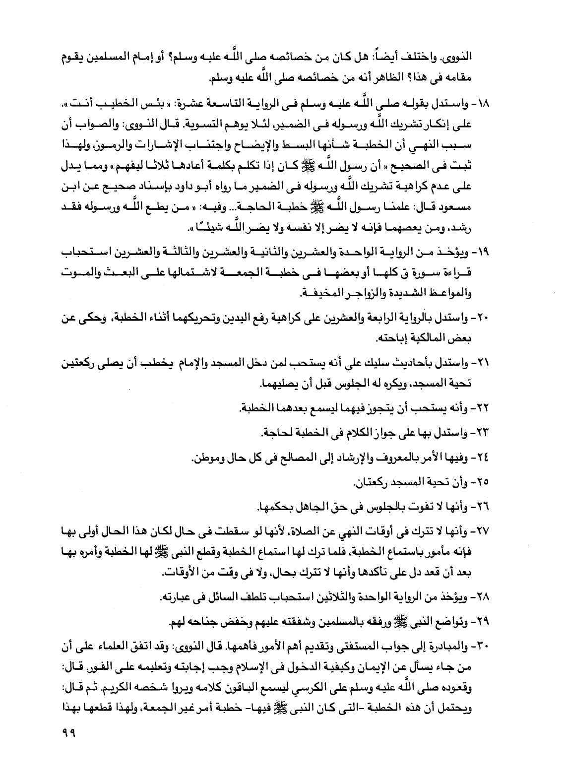30 - والمبادرة إلى جواب المستفتي وتقديم أهل الأمور فأهمها. قال النووي: وقد اتفق العلماء على أن من جاء يسأل عن الإيمان وكيفية الدخول في الإسلام وجب إجابته وتعليمه على الفور. قال: وقعوده صلى الله عليه وسلم على الكرسي ليسمع الباقون كلامه ويروا شخصه الكريم. ثم قال: ويحتمل أن هذه الخطبة -التي كان النبي صلى الله عليه وسلم فيها- خطبة أمر غير الجمعة، ولهذا قطعها بهذا