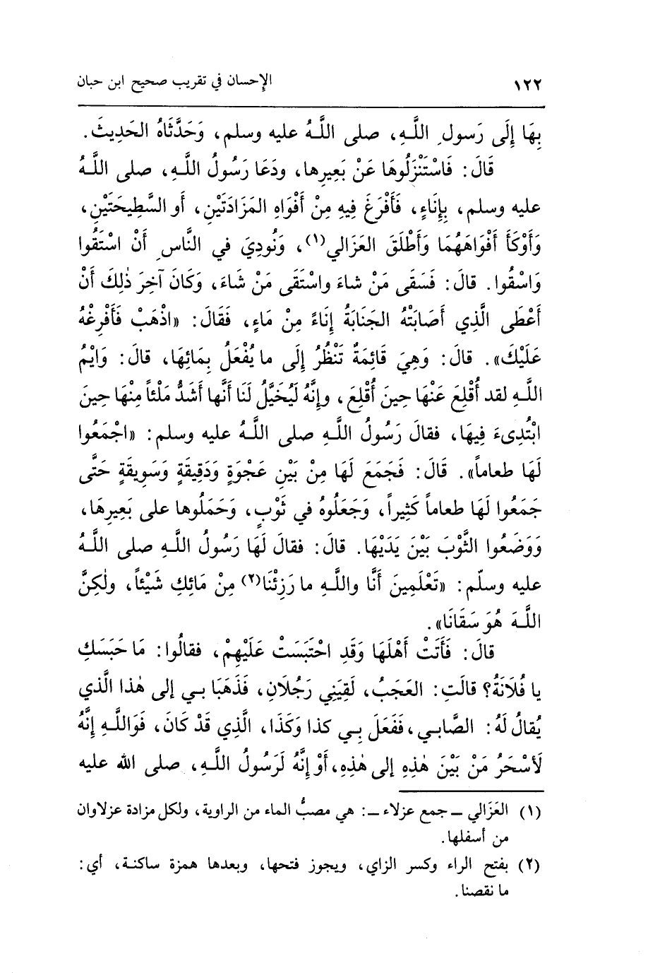 بِهَا إِلَى رَسُولِ اللَّهِ صَلَّى اللَّهُ عَلَيْهِ وَسَلَّمَ وَحَدَّثَاهُ الْحَدِيثَ قَالَ فَاسْتَنْزَلُوهَا عَنْ بَعِيرِهَا وَدَعَا رَسُولُ اللَّهِ صَلَّى اللَّهُ عَلَيْهِ وَسَلَّمَ بِإِنَاءٍ فَأَفْرَغَ فِيهِ مِنْ أَفْوَاهِ الْمَزَادَتَيْنِ أَوِ السَّطِيحَتَيْنِ وَأَوْكَأَ أَفْوَاهَهُمَا وَأَطْلَقَ الْعَزَالِي1 وَنُودِيَ فِي النَّاسِ أَنِ اسْتَقُوا وَاسْقُوا قَالَ فَسَقَى مَنْ شَاءَ وَاسْتَقَى مَنْ شَاءَ وَكَانَ آخِرُ ذَلِكَ أن أعطي الذي أصابته الجنابة إناء من مَاءٍ فَقَالَ اذْهَبْ فَأَفْرِغْهُ عَلَيْكَ قَالَ وَهِيَ قَائِمَةٌ تَنْظُرُ إِلَى مَا يَفْعَلُ بِمَائِهَا قَالَ وَايْمُ اللَّهِ لَقَدْ أُقْلِعَ عَنْهَا حِينَ أُقْلِعَ وَإِنَّهُ لَيُخَيَّلُ لَنَا أَنَّهَا أَشَدُّ مَلْئًا مِنْهَا حين ابتدىء فِيهَا فَقَالَ: رَسُولُ اللَّهِ صَلَّى اللَّهُ عَلَيْهِ وَسَلَّمَ "اجْمَعُوا لَهَا طَعَامًا" قَالَ فَجَمَعَ لَهَا مِنْ بَيْنِ عَجْوَةٍ وَدَقِيقَةٍ وَسَوِيقَةٍ حَتَّى جَمَعُوا لَهَا طَعَامًا كَثِيرًا وَجَعَلُوهُ فِي ثَوْبٍ وَحَمَلُوهَا عَلَى بَعِيرِهَا وَوَضَعُوا الثَّوْبَ بَيْنَ يَدَيْهَا قَالَ فَقَالَ: لَهَا رَسُولُ اللَّهِ صَلَّى اللَّهُ عَلَيْهِ وَسَلَّمَ: "تَعْلَمِينَ أَنَّا وَاللَّهِ مَا رَزِئْنَا2 مِنْ مَائِكَ شَيْئًا وَلَكِنَّ اللَّهَ هُوَ سَقَانَا".