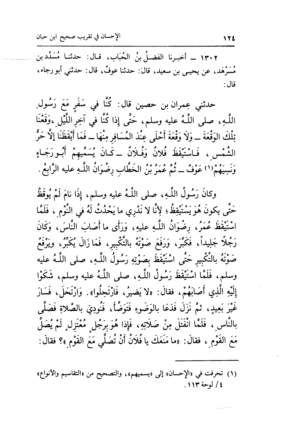 حَدَّثَنِي عِمْرَانُ بْنُ حُصَيْنٍ قَالَ كُنَّا فِي سَفَرٍ مَعَ رَسُولِ اللَّهِ صَلَّى اللَّهُ عَلَيْهِ وَسَلَّمَ حَتَّى إِذَا كُنَّا فِي آخِرِ اللَّيْلِ وَقَعْنَا تِلْكَ الْوَقْعَةَ وَلَا وَقْعَةَ أَحْلَى عِنْدَ الْمُسَافِرِ مِنْهَا فَمَا أَيْقَظَنَا إِلَّا حَرُّ الشَّمْسِ فَاسْتَيْقَظَ فُلَانٌ وَفُلَانٌ وَكَانَ يُسَمِّيهِمْ أَبُو رَجَاءٍ وَنَسِيَهُمْ1 عَوْفٌ ثُمَّ عُمَرُ بْنُ الْخَطَّابِ رِضْوَانُ الله عليهم الرَّابِعُ.