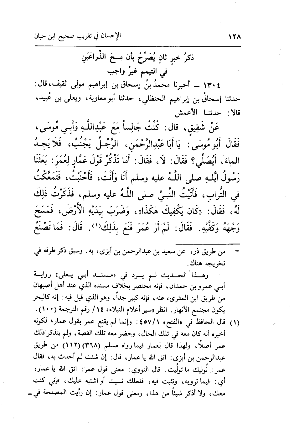 عَنْ شَقِيقٍ قَالَ كُنْتُ جَالِسًا مَعَ عَبْدِ اللَّهِ وَأَبِي مُوسَى فَقَالَ أَبُو مُوسَى يَا أَبَا عَبْدِ الرَّحْمَنِ الرَّجُلُ يُجْنِبُ فَلَا يَجِدُ الْمَاءَ أَيُصَلِّي فَقَالَ لَا فَقَالَ أَمَا تَذْكُرُ قَوْلَ عَمَّارٍ لِعُمَرَ بَعَثَنَا رَسُولُ اللَّهِ صَلَّى اللَّهُ عَلَيْهِ وَسَلَّمَ أَنَا وَأَنْتَ فَأَجْنَبْتُ فَتَمَعَّكْتُ فِي التُّرَابِ فَأَتَيْتُ النَّبِيَّ صَلَّى اللَّهُ عَلَيْهِ وَسَلَّمَ فَذَكَرْتُ ذَلِكَ لَهُ فَقَالَ: "كَانَ يَكْفِيكَ هَكَذَا"، وَضَرَبَ بِيَدِهِ الْأَرْضَ فَمَسَحَ وَجْهَهُ وَكَفَّيْهِ فَقَالَ لَمْ أَرَ عُمَرَ قَنَعَ بِذَلِكَ1. قَالَ فَمَا تصنع
