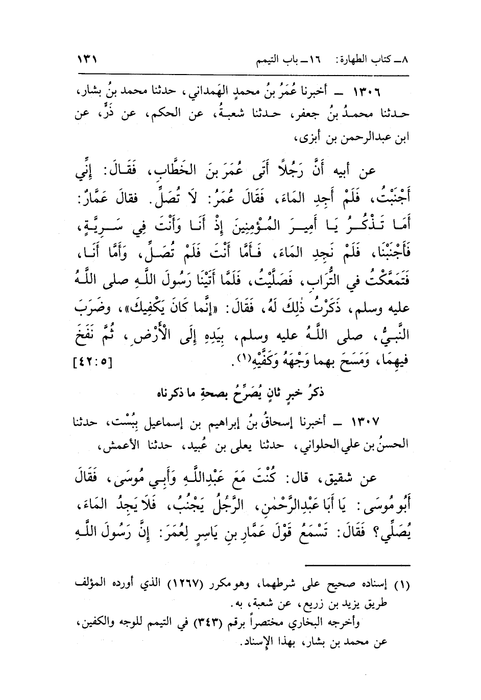 1306 - أَخْبَرَنَا عُمَرُ بْنُ مُحَمَّدٍ الْهَمْدَانِيُّ حَدَّثَنَا مُحَمَّدُ بْنُ بَشَّارٍ حَدَّثَنَا مُحَمَّدُ بْنُ جَعْفَرٍ حَدَّثَنَا شُعْبَةُ عَنْ الحكم عن ذر عن بْنِ عَبْدِ الرَّحْمَنِ بْنِ أَبْزَى،