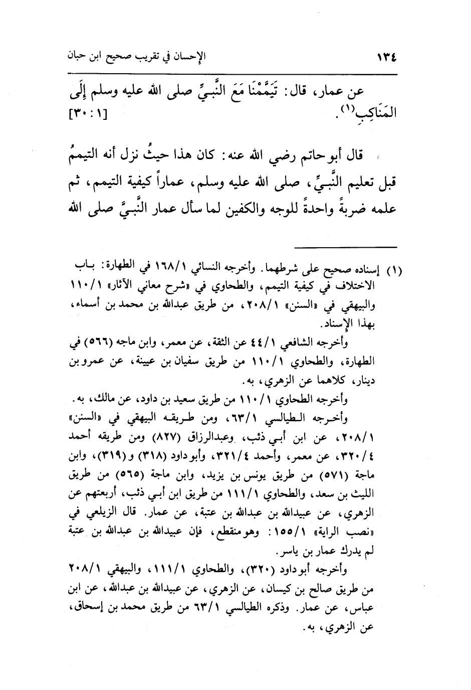 قَالَ أَبُو حاتم رضى الله تعالى عَنْهُ كَانَ هَذَا حَيْثُ نَزَلَ آيَةُ التَّيَمُّمِ قَبْلَ تَعْلِيمِ النَّبِيِّ صَلَّى اللَّهُ عَلَيْهِ وَسَلَّمَ عَمَّارًا كَيْفِيَّةَ التَّيَمُّمِ ثُمَّ عَلَّمَهُ ضَرْبَةً وَاحِدَةً لِلْوَجْهِ وَالْكَفَّيْنِ لَمَّا سَأَلَ عَمَّارٌ النَّبِيَّ صَلَّى الله