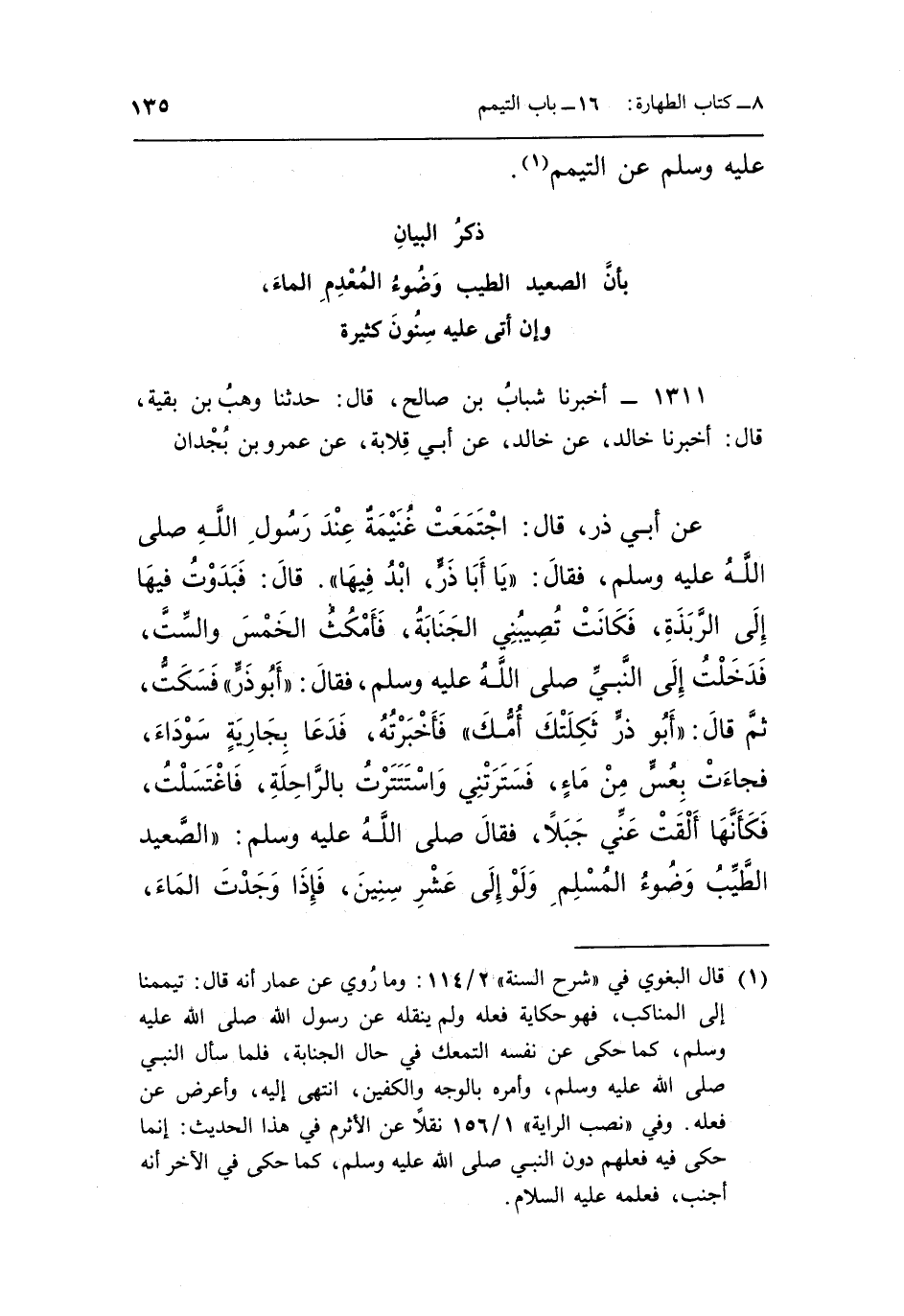 عَنْ أَبِي ذَرٍّ قَالَ اجْتَمَعَتْ غَنِيمَةٌ عِنْدَ رَسُولِ اللَّهِ صَلَّى اللَّهُ عَلَيْهِ وَسَلَّمَ فَقَالَ: "يَا أَبَا ذَرٍّ ابْدُ فِيهَا" قَالَ فَبَدَوْتُ فِيهَا إِلَى الرَّبَذَةِ فَكَانَتْ تُصِيبُنِي الْجَنَابَةُ فَأَمْكُثُ الْخَمْسَ وَالسِّتَّ فَدَخَلْتُ إِلَى النَّبِيِّ صَلَّى اللَّهُ عَلَيْهِ وَسَلَّمَ فَقَالَ: "أَبُو ذَرٍّ" فَسَكَتُّ ثُمَّ قَالَ: "أَبُو ذَرٍّ ثَكِلَتْكَ أُمُّكَ" فَأَخْبَرْتُهُ فَدَعَا بِجَارِيَةٍ سَوْدَاءَ فَجَاءَتْ بِعُسٍّ مِنْ مَاءٍ فَسَتَرَتْنِي وَاسْتَتَرْتُ بِالرَّاحِلَةِ فَاغْتَسَلْتُ فَكَأَنَّهَا أَلْقَتْ عَنِّي جَبَلًا فَقَالَ صَلَّى اللَّهُ عَلَيْهِ وَسَلَّمَ: "الصَّعِيدُ الطَّيِّبُ وَضُوءُ الْمُسْلِمِ وَلَوْ إِلَى عَشْرِ سِنِينَ فَإِذَا وَجَدْتَ الماء،