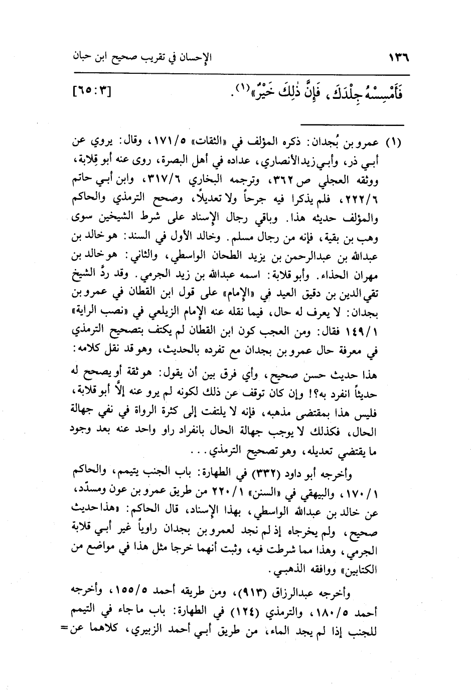 وأخرجه أبو داود [332] في الطهارة: باب الجنب يتيمم، والحاكم 1/170، والبيهقي في "السنن" 1/220 من طريق عمرو بن عون ومسدد، عن خالد بن عبد الله الواسطي، بهذا الإسناد، قال الحاكم: "هذا حديث صحيح، ولم يخرجاه إذ لم نجد لعمرو بن بجدان راوياً غير أبي قلابة الجرمي، وهذا مما شرطت فيه، وثبت أنهما خرجا مثل هذا في مواضع من الكتابين" ووافقه الذهبي.