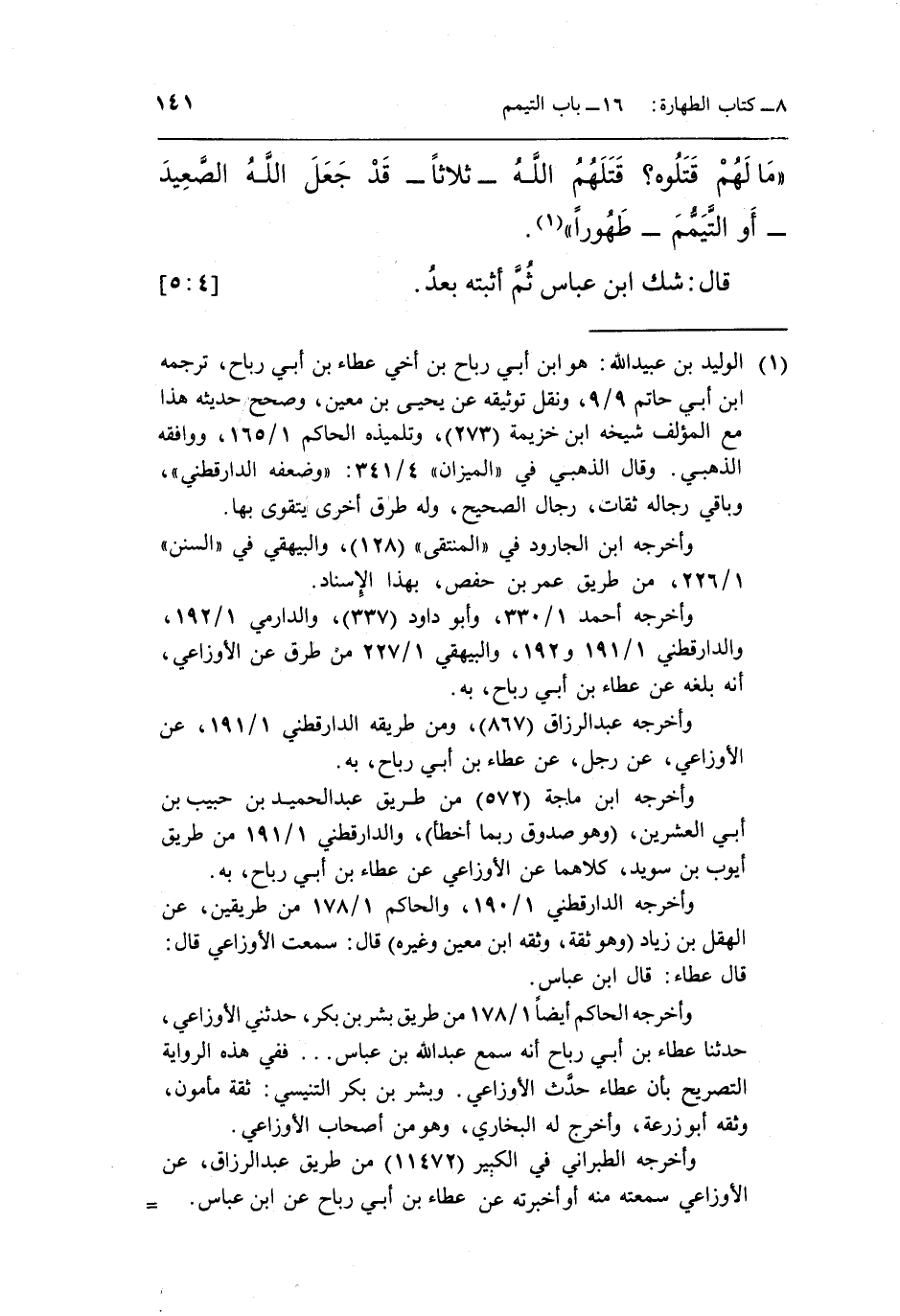 وأخرجه الحاكم أيضاً 1/ 178 من طريق بشر بن بكر، حدثني الأوزاعي، حدثنا عطاء بن أبي رباح أنه سمع عبد الله بن عباس ... ففي هذه الرواية التصريح بأن عطاء حدث الأوزاعي. وبشر بن بكر التنيسي: ثقة مأمون، وثقه أبو زرعة، وأخرج له البخاري، وهو من أصحاب الأوزاعي.