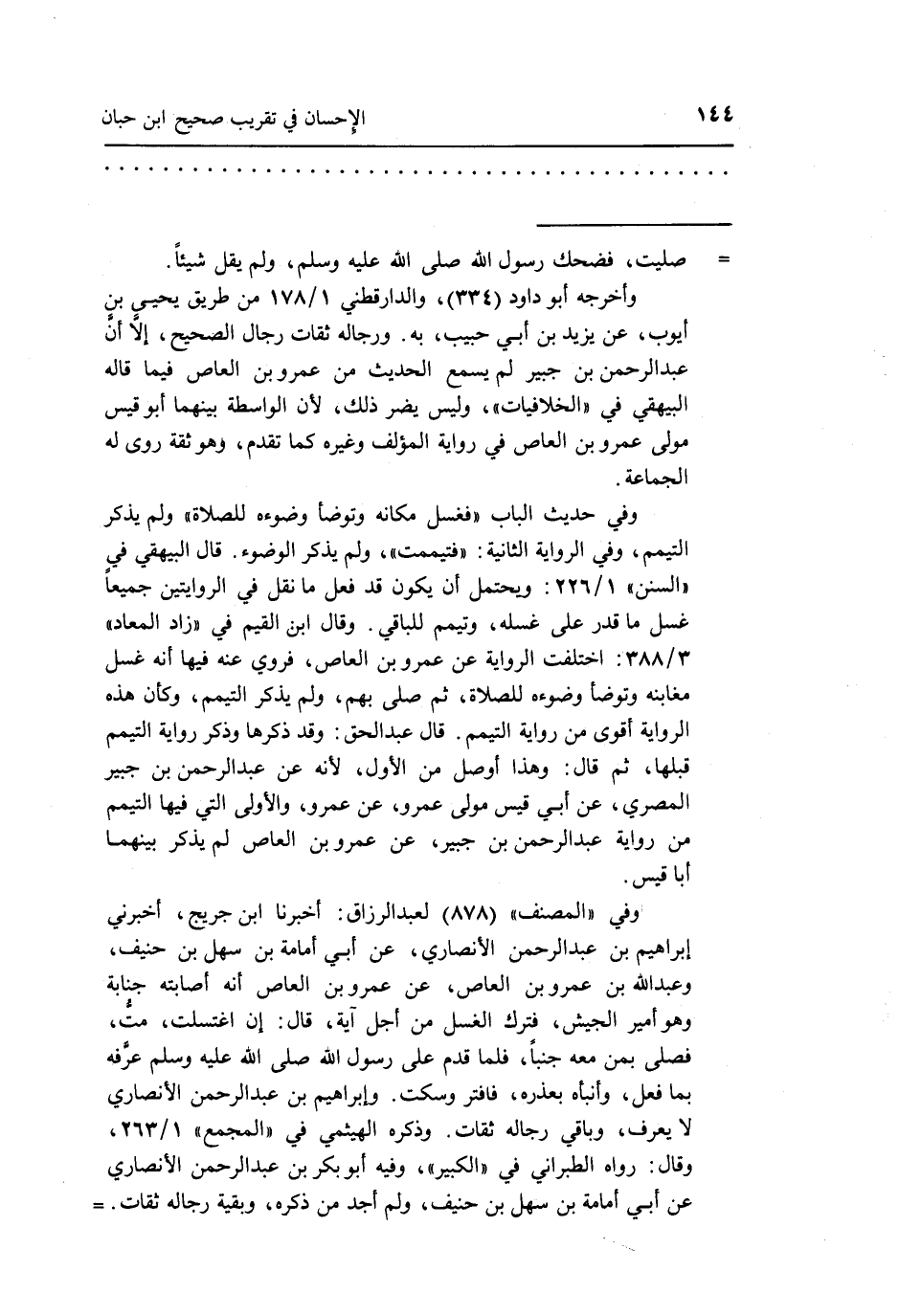 == صليت فضحك رسول الله صلى الله عليه وسلم ولم يقل شيئا. واخرجه أبو داود"334" والدارقطني 1/178من طريق يحيى بن أيوب عن يزيد بن ابي حبيب به ورجاله ثقات رجال الصحيح إلا أن عبد الرحمن بن جبير لم يسمع الحديث من عمرو بن العاص فيما قاله البيهقي في الخلافيات وليس يضر ذلك لأن الواسطة بينهما أبو قيس مولى عمرو بن العاص في رواية المؤلف وغيره كما تقدم وهو ثقة روى له الجماعة.
