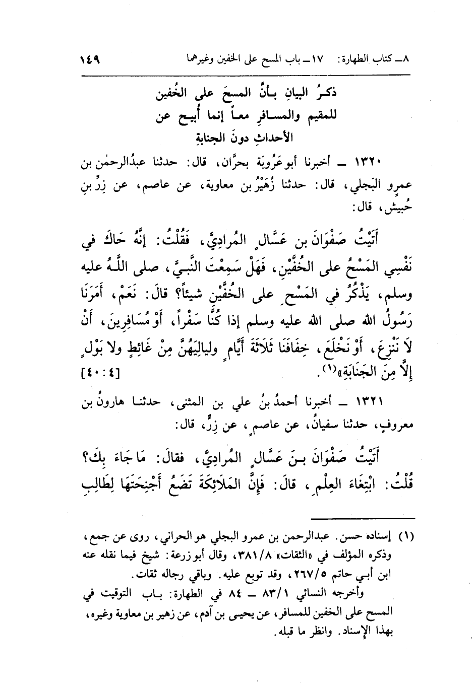 أَتَيْتُ صَفْوَانَ بْنَ عَسَّالٍ الْمُرَادِيَّ فَقُلْتُ إِنَّهُ حَاكَ فِي نَفْسِي الْمَسْحُ عَلَى الْخُفَّيْنِ فَهَلْ سَمِعْتَ النَّبِيَّ صَلَّى اللَّهُ عَلَيْهِ وَسَلَّمَ يَذْكُرُ فِي الْمَسْحِ عَلَى الْخُفَّيْنِ شَيْئًا قَالَ: نَعَمْ، أَمَرَنَا رَسُولُ اللَّهِ صَلَّى اللَّهُ عَلَيْهِ وَسَلَّمَ إِذَا كُنَّا سَفَرًا أَوْ مسافرين أن لا ننزع خفافنا أَوْ نَخْلَعَ خِفَافَنَا ثَلَاثَةَ أَيَّامٍ وَلَيَالِيَهُنَّ مِنْ غائط ولا بول إلا مِنَ الْجَنَابَةِ1".