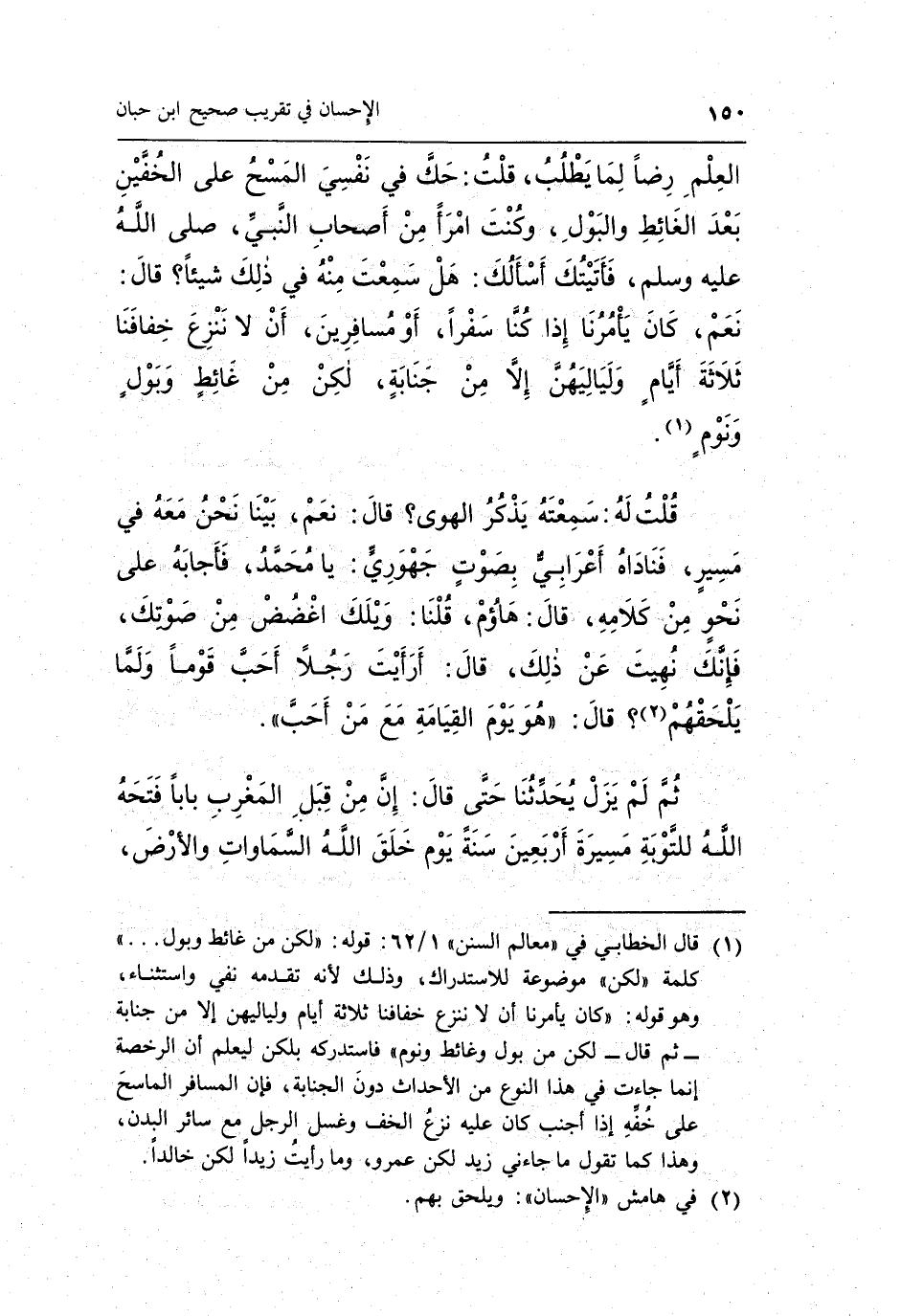 1 قال الخطابي في"معالم السنن" 1/62: قوله: "لكن من غائط وبول ... " كلمة "لكن" موضوعة للاستدراك، وذلك لا، هـ تقدمه نفي واستثناء، وهو قوله: "كان يأمرنا أن لا ننزع خفافنا ثلاثة أيام ولياليهن إلا من جنابة –ثم قال- لكن من بول وغائط ونوم" فاستدركه بلكن ليعلم أن الرخصة إنما جاءت في هذا النوع من الأحداث دون الجنابة، فإن المسافر الماسح على خفه إذا أجنب كان عليه نزع الخف وغسل الرجل مع سائر البدن، وهذا كما تقول ما جاءني زيد لكن عمرو، وما رأيت زيداً لكن خالداً.