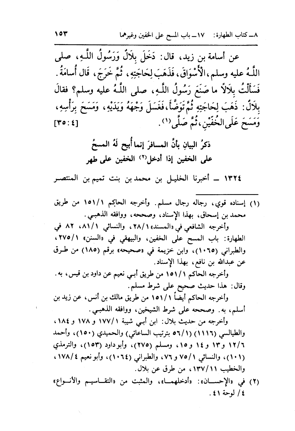 ذِكْرُ الْبَيَانِ بِأَنَّ الْمُسَافِرَ إِنَّمَا أُبِيحَ لَهُ الْمَسْحُ عَلَى الْخُفَّيْنِ إِذَا أَدْخَلَ2 الْخُفَّيْنِ عَلَى طهر