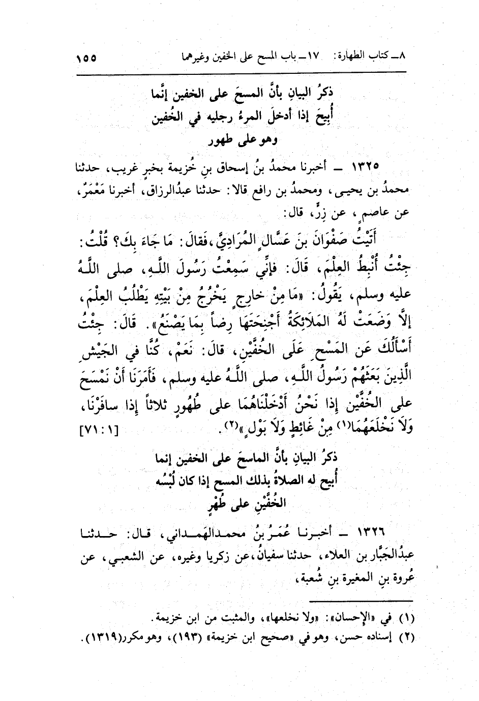 أَتَيْتُ صَفْوَانَ بْنَ عَسَّالٍ الْمُرَادِيَّ فَقَالَ مَا جَاءَ بِكَ قُلْتُ جِئْتُ أَنْبِطُ الْعِلْمَ قَالَ فَإِنِّي سَمِعْتُ رَسُولَ اللَّهِ صَلَّى اللَّهُ عَلَيْهِ وَسَلَّمَ يَقُولُ: "مَا مِنْ خَارِجٍ يَخْرُجُ مِنْ بَيْتِهِ يَطْلُبُ الْعِلْمَ إِلَّا وَضَعَتْ لَهُ الْمَلَائِكَةُ أَجْنِحَتَهَا رِضًا بِمَا يَصْنَعُ" قَالَ جِئْتُ أَسْأَلُكَ عَنِ الْمَسْحِ عَلَى الْخُفَّيْنِ قَالَ نَعَمْ كُنَّا فِي الْجَيْشِ الَّذِينَ بَعَثَهُمْ رَسُولُ اللَّهِ صَلَّى اللَّهُ عَلَيْهِ وَسَلَّمَ فَأَمَرَنَا أَنْ نَمْسَحَ عَلَى الْخُفَّيْنِ إِذَا نَحْنُ أَدْخَلْنَاهُمَا عَلَى طُهُورٍ ثَلَاثًا إِذَا سَافَرْنَا وَلَا نَخْلَعُهُمَا1 مِنْ غَائِطٍ ولا بول2.