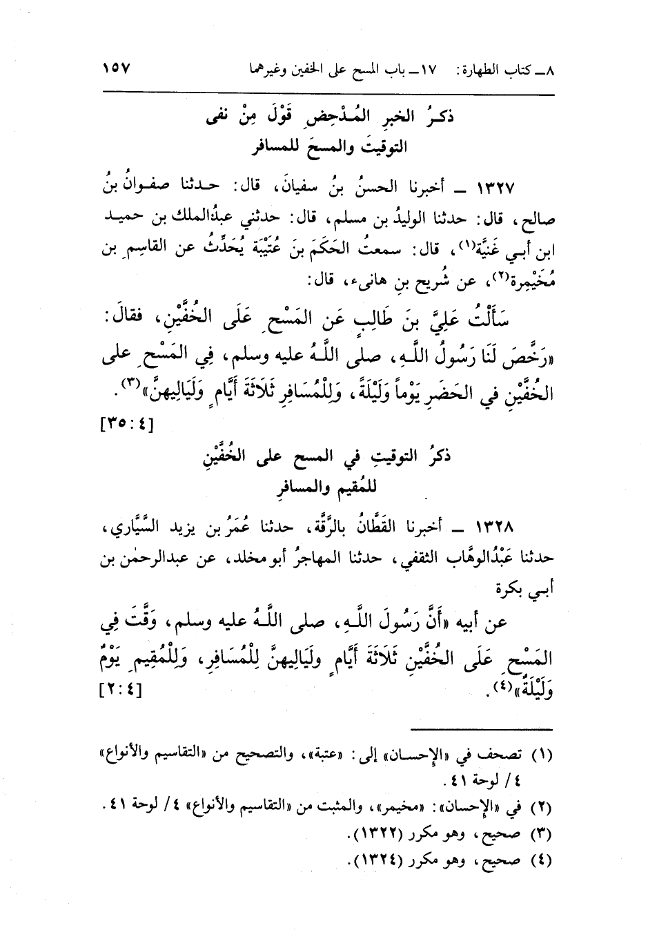 1327 - أَخْبَرَنَا الْحَسَنُ بْنُ سُفْيَانَ قَالَ حَدَّثَنَا صَفْوَانُ بْنُ صَالِحٍ قَالَ حَدَّثَنَا الْوَلِيدُ بْنُ مُسْلِمٍ قَالَ حَدَّثَنِي عَبْدُ الْمَلِكِ بْنُ حُمَيْدِ بْنِ أَبِي غَنِيَّةَ1 قَالَ سَمِعْتُ الْحَكَمَ بْنَ عُتَيْبَةَ يُحَدِّثُ عَنِ الْقَاسِمِ بْنِ مُخَيْمِرَةَ2 عَنْ شُرَيْحِ بْنِ هَانِئٍ قَالَ سَأَلْتُ عَلِيَّ بن طالب عن المسح عن الْخُفَّيْنِ فَقَالَ رَخَّصَ لَنَا رَسُولُ اللَّهِ صَلَّى اللَّهُ عَلَيْهِ وَسَلَّمَ فِي الْمَسْحِ عَلَى الْخُفَّيْنِ فِي الْحَضَرِ يَوْمًا وَلَيْلَةً وَلِلْمُسَافِرِ ثَلَاثَةً أَيَّامٍ ولياليهن3.