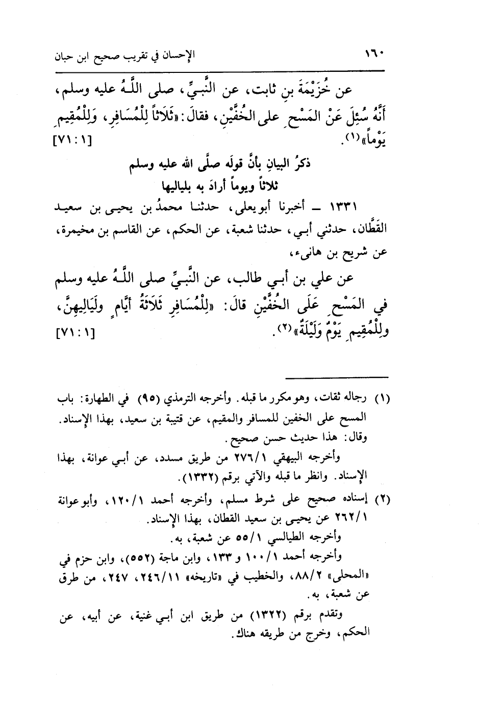 عَنْ عَلِيِّ بْنِ أَبِي طَالِبٍ عَنِ النَّبِيِّ صَلَّى اللَّهُ عَلَيْهِ وَسَلَّمَ فِي الْمَسْحِ عَلَى الْخُفَّيْنِ قَالَ: "لِلْمُسَافِرِ ثَلَاثَةُ أَيَّامٍ ولياليهن وللمقيم يوم وليلة" 2.