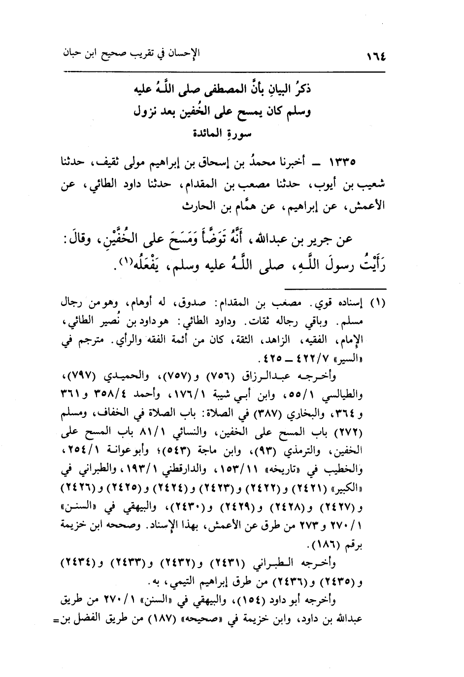 ذِكْرُ الْبَيَانِ بِأَنَّ الْمُصْطَفَى صَلَّى اللَّهُ عَلَيْهِ وَسَلَّمَ كَانَ يَمْسَحُ عَلَى الْخُفَّيْنِ بَعْدَ نُزُولِ سُورَةِ الْمَائِدَةِ