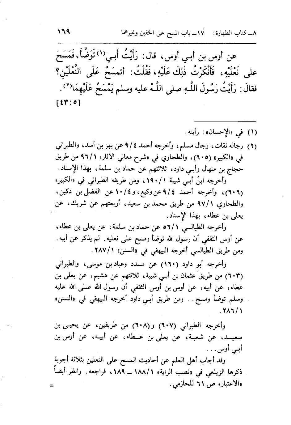 وقد أجاب أهل العلم عن أحاديث المسح على النعلين بثلاثة أجوبة ذكرها الزيلعي في"نصب الراية" 1/188-189، فراجعه. وانظر أيضاً "الاعتبار" ص61 للحازمي =