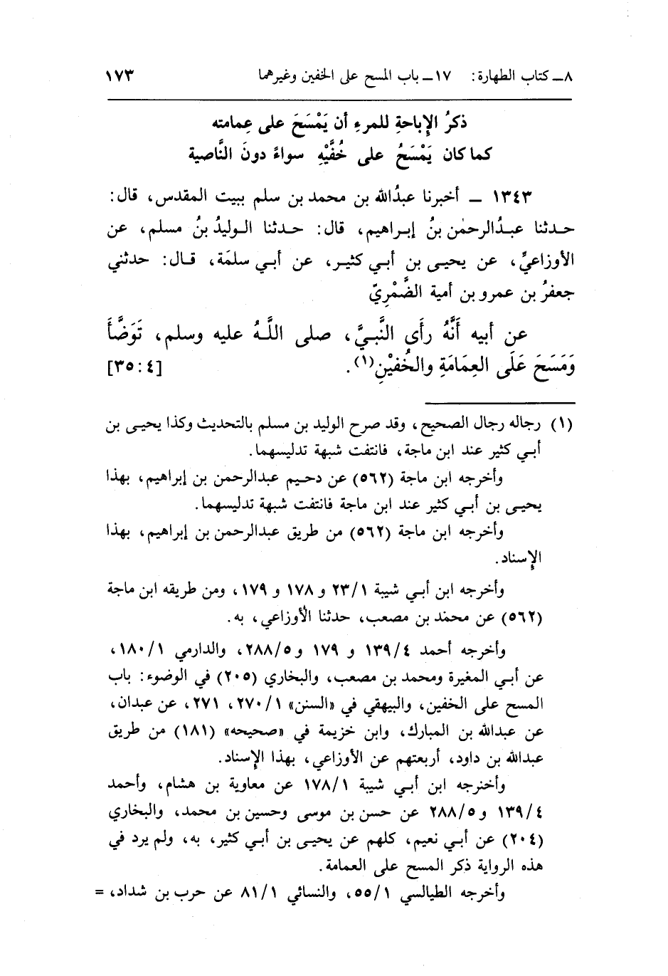 وأخرجه ابن أبي شيبة 1/ 178 عن معاوية بن هشام، وأحمد 4/ 139 و 5/ 288 عن حسن بن موسى وحسين بن محمد، والبخاري [204] عن أبي نعيم، كلهم عن يحيى بن أبي كثير، به، ولم يرد في هذه الرواية ذكر المسح على العمامة.