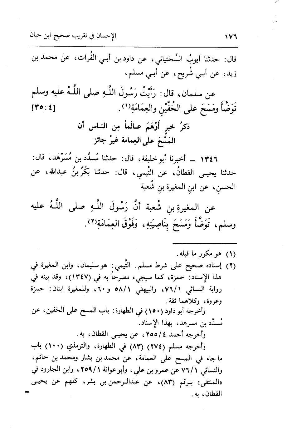 عَنِ الْمُغِيرَةِ بْنِ شُعْبَةَ أن رسول الله صلى الله عليه وسلم تَوَضَّأَ وَمَسَحَ بِنَاصِيَتِهِ وَفَوْقَ الْعِمَامَةِ 2.