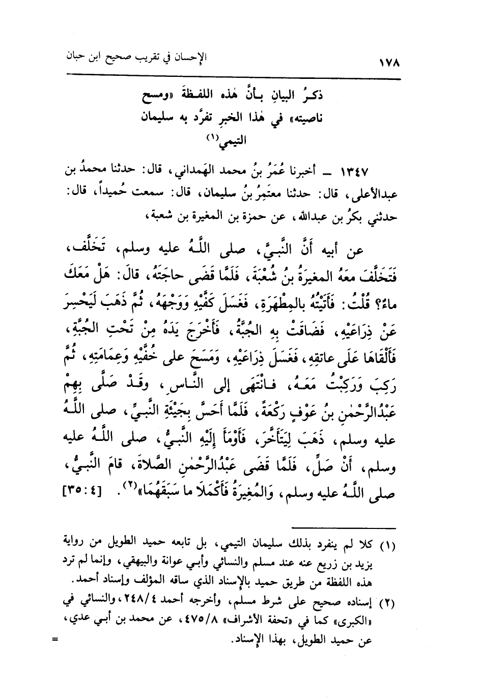1347- أَخْبَرَنَا عُمَرُ بْنُ مُحَمَّدٍ الْهَمْدَانِيُّ قَالَ حَدَّثَنَا مُحَمَّدُ بْنُ عَبْدِ الْأَعْلَى قَالَ حَدَّثَنَا مُعْتَمِرُ بْنُ سُلَيْمَانَ قَالَ سَمِعْتُ حُمَيْدًا قَالَ حَدَّثَنِي بَكْرُ بْنُ عَبْدِ اللَّهِ عَنْ حَمْزَةَ بْنِ الْمُغِيرَةِ بْنِ شُعْبَةَ
