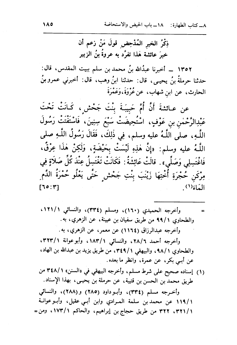 عَنْ عَائِشَةَ أَنَّ أُمَّ حَبِيبَةَ بِنْتَ جَحْشٍ كَانَتْ تَحْتَ عَبْدِ الرَّحْمَنِ بْنِ عَوْفٍ اسْتُحِيضَتْ سَبْعَ سِنِينَ فَاسْتَفْتَتْ رسول الله صلى الله عليه وسلم في ذَلِكَ فَقَالَ: رَسُولُ اللَّهِ صَلَّى اللَّهُ عَلَيْهِ وَسَلَّمَ: "إِنَّ هَذِهِ لَيْسَتْ بِحَيْضَةٍ وَلَكِنْ هَذَا عِرْقٌ فَاغْتَسِلِي وَصَلِّي". قَالَتْ عَائِشَةُ فَكَانَتْ تَغْتَسِلُ عِنْدَ كُلِّ صَلَاةٍ فِي مِرْكَنِ حُجْرَةِ أُخْتِهَا زَيْنَبَ بِنْتِ جَحْشٍ حَتَّى يَعْلُوَ حُمْرَةُ الدَّمِ الماء1.