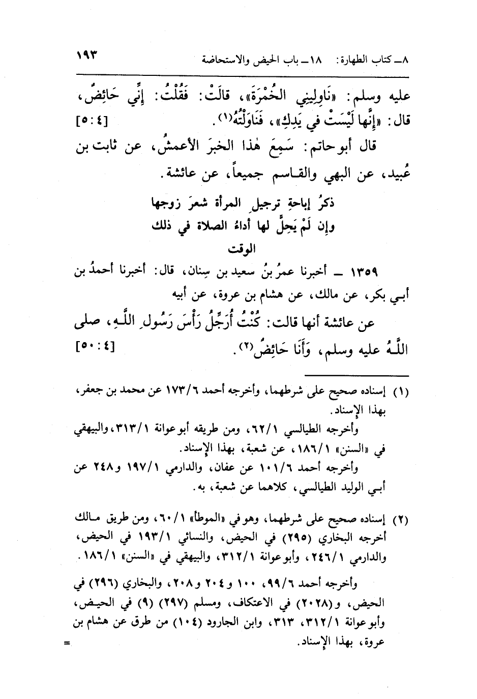 1359 - أَخْبَرَنَا عُمَرُ بْنُ سَعِيدِ بْنِ سِنَانٍ، قَالَ: أَخْبَرَنَا أَحْمَدُ بْنُ أَبِي بَكْرٍ، عَنْ مَالِكٍ، عَنْ هِشَامِ بْنِ عُرْوَةَ، عَنْ أَبِيهِ، عَنْ عَائِشَةَ، أَنَّهَا قَالَتْ: «كُنْتُ أُرَجِّلُ رَأْسَ رَسُولِ اللَّهِ صَلَّى اللَّهُ عَلَيْهِ وَسَلَّمَ وَأَنَا حَائِضٌ» (¬2) . [4: 50]
