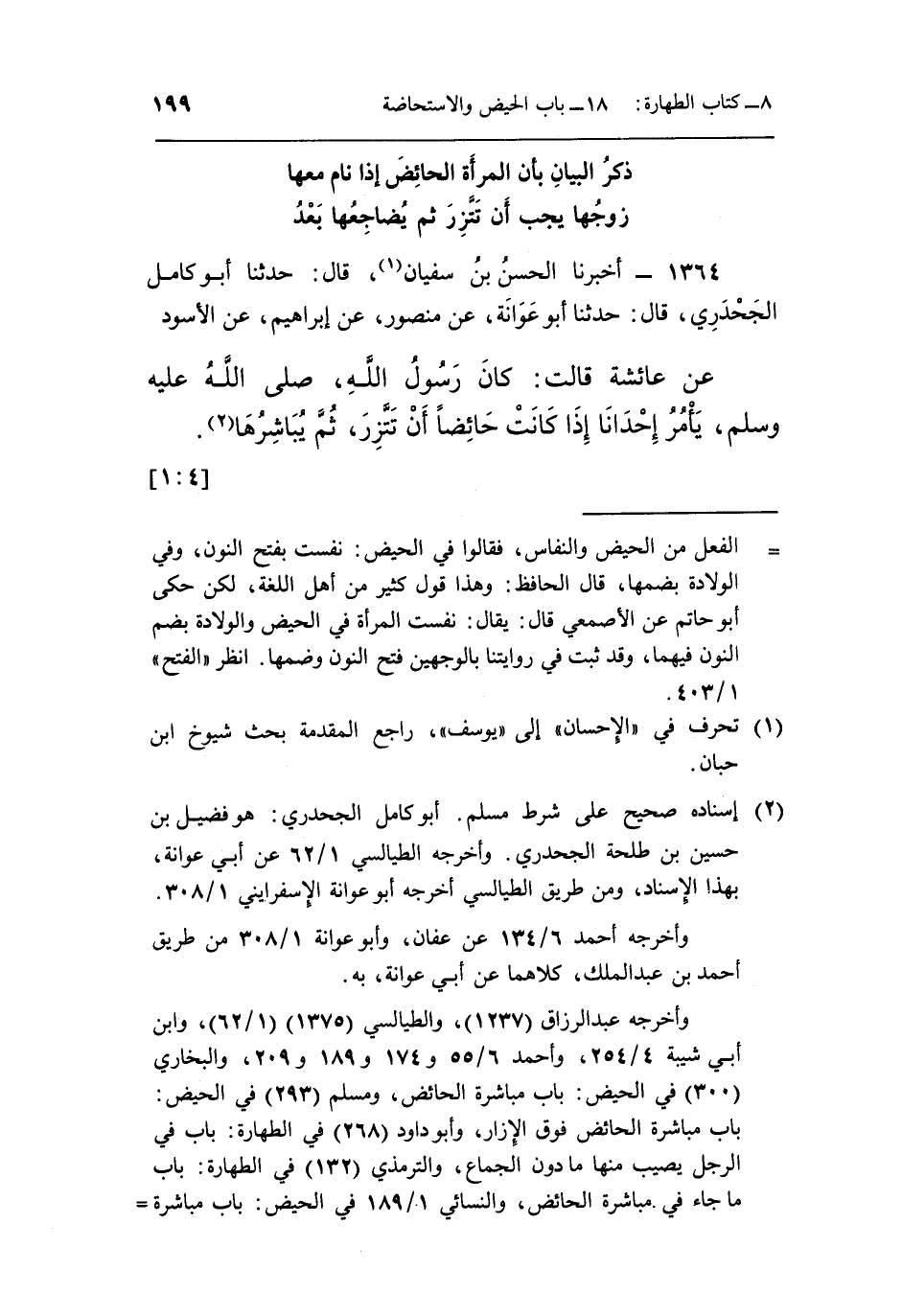 1364 - أَخْبَرَنَا الْحَسَنُ بْنُ سُفْيَانَ (¬1) ، قَالَ: حَدَّثَنَا أَبُو كَامِلٍ الْجَحْدَرِيُّ، قَالَ: حَدَّثَنَا أَبُو عَوَانَةَ، عَنْ مَنْصُورٍ، عَنْ إِبْرَاهِيمَ، عَنِ الْأَسْوَدِ، عَنْ عَائِشَةَ، قَالَتْ: «كَانَ رَسُولُ اللَّهِ صَلَّى اللَّهُ عَلَيْهِ وَسَلَّمَ، يَأْمُرُ إِحْدَانَا إِذَا كَانَتْ حَائِضًا أَنْ تَتَّزِرَ ثُمَّ يُبَاشِرُهَا» (¬2) . [4: 1]