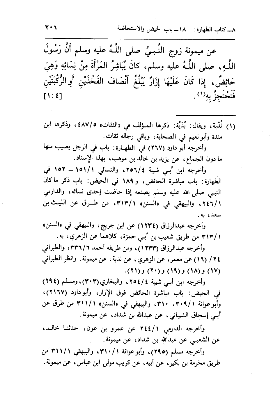 عَنْ مَيْمُونَةَ زَوْجِ النَّبِيِّ صَلَّى اللَّهُ عَلَيْهِ وَسَلَّمَ: «أَنَّ رَسُولَ اللَّهِ صَلَّى اللَّهُ عَلَيْهِ وَسَلَّمَ كَانَ يُبَاشِرُ الْمَرْأَةَ مِنْ نِسَائِهِ وَهِيَ حَائِضٌ، إِذَا كَانَ عَلَيْهَا إِزَارٌ يَبْلُغُ أَنْصَافَ الْفَخِذَيْنِ، أَوِ الرُّكْبَتَيْنِ فَتَحْتَجِزُ بِهِ» (¬1) . [4: 1]