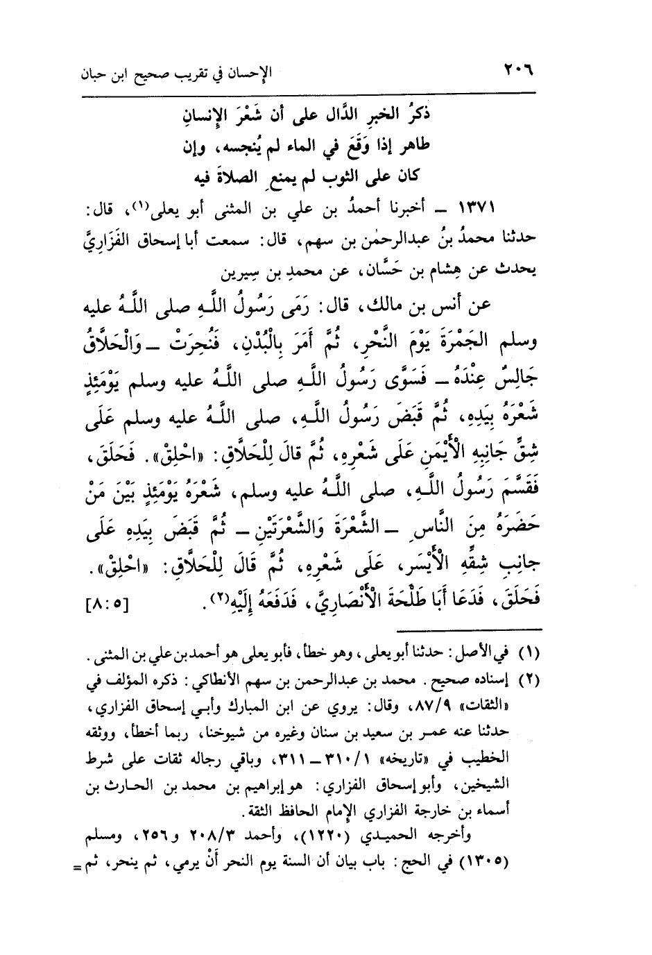 1371 - أَخْبَرَنَا أَحْمَدُ بْنُ عَلِيِّ بْنِ الْمُثَنَّى أَبُو يَعْلَى (¬1) ، قَالَ: حَدَّثَنَا مُحَمَّدُ بْنُ عَبْدِ الرَّحْمَنِ بْنِ سَهْمٍ، قَالَ: سَمِعْتُ أَبَا إِسْحَاقَ الْفَزَارِيَّ، يُحَدِّثُ عَنْ هِشَامِ بْنِ حَسَّانَ، عَنْ مُحَمَّدِ بْنِ سِيرِينَ، عَنْ أَنَسِ بْنِ مَالِكٍ، قَالَ: «رَمَى رَسُولُ اللَّهِ صَلَّى اللَّهُ عَلَيْهِ وَسَلَّمَ الْجَمْرَةَ يَوْمَ النَّحْرِ، ثُمَّ أَمَرَ بِالْبُدْنِ فَنُحِرَتْ - وَالْحَلَّاقُ جَالِسٌ عِنْدَهُ - فَسَوَّى رَسُولُ اللَّهِ صَلَّى اللَّهُ عَلَيْهِ وَسَلَّمَ، يَوْمَئِذٍ شَعْرَهُ بِيَدِهِ، ثُمَّ قَبَضَ رَسُولُ اللَّهِ صَلَّى اللَّهُ عَلَيْهِ وَسَلَّمَ عَلَى شَقِّ جَانِبِهِ الْأَيْمَنِ عَلَى شَعْرِهِ» ، ثُمَّ قَالَ لِلْحَلَّاقِ: «احْلِقْ» فَحَلَقَ، «فَقَسَمَ رَسُولُ اللَّهِ صَلَّى اللَّهُ عَلَيْهِ وَسَلَّمَ شَعْرَهُ يَوْمَئِذٍ بَيْنَ مَنْ حَضَرَهُ مِنَ النَّاسِ - الشَّعَرَةَ وَالشَّعَرَتَيْنِ - ثُمَّ قَبَضَ بِيَدِهِ عَلَى جَانِبِ شِقِّهِ الْأَيْسَرِ عَلَى شَعْرِهِ» ، ثُمَّ قَالَ لِلْحَلَّاقِ: «احْلِقْ» ، فَحَلَقَ، فَدَعَا أَبَا طَلْحَةَ الْأَنْصَارِيَّ، فَدَفَعَهُ إِلَيْهِ (¬2) . [5: 8]