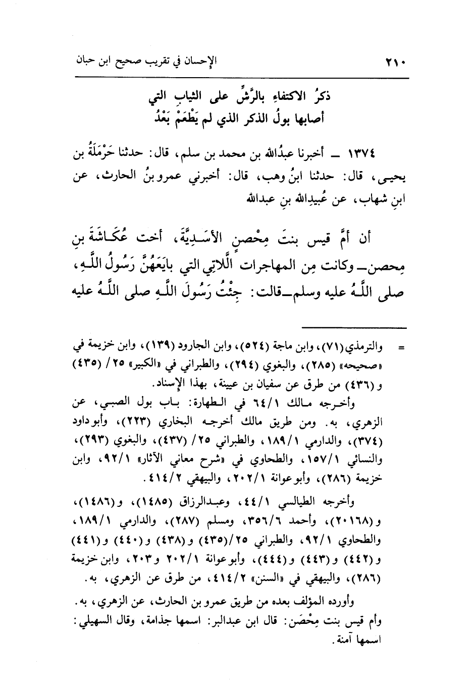 1374 - أَخْبَرَنَا عَبْدُ اللَّهِ بْنُ مُحَمَّدِ بْنِ سَلْمٍ، قَالَ: حَدَّثَنَا حَرْمَلَةُ بْنُ يَحْيَى، قَالَ: حَدَّثَنَا ابْنُ وَهْبٍ، قَالَ: أَخْبَرَنِي عَمْرُو بْنُ الْحَارِثِ، عَنِ ابْنِ شِهَابٍ، عَنْ عُبَيْدِ اللَّهِ بْنِ عَبْدِ اللَّهِ، أَنَّ أُمَّ قَيْسٍ بِنْتَ مِحْصَنٍ الْأَسَدِيَّةَ، أُخْتُ عُكَّاشَةَ بْنِ مِحْصَنٍ - وَكَانَتْ مِنَ الْمُهَاجِرَاتِ الَّتِي بَايَعَهُنَّ رَسُولُ اللَّهِ صَلَّى اللَّهُ عَلَيْهِ وَسَلَّمَ - قَالَتْ: «جِئْتُ رَسُولَ اللَّهِ صَلَّى اللَّهُ عَلَيْهِ