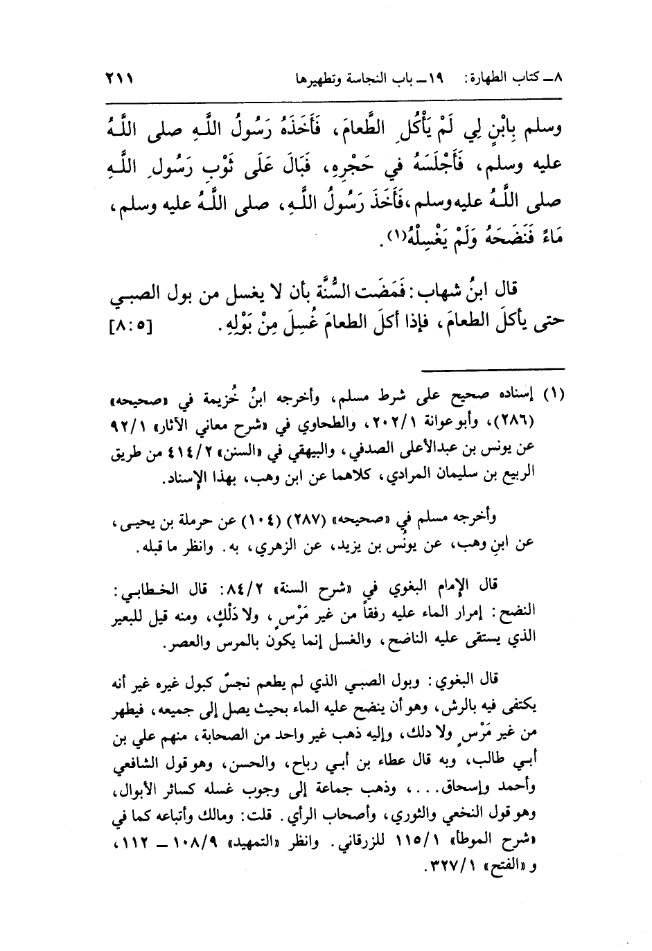 قَالَ ابْنُ شِهَابٍ: «فَمَضَتِ السُّنَّةُ بِأَنْ لَا يُغْسَلَ مِنْ بَوْلِ الصَّبِيِّ حَتَّى يَأْكُلَ الطَّعَامَ، فَإِذَا أَكَلَ الطَّعَامَ غُسِلَ مِنْ بَوْلِهِ» [5: 8]
