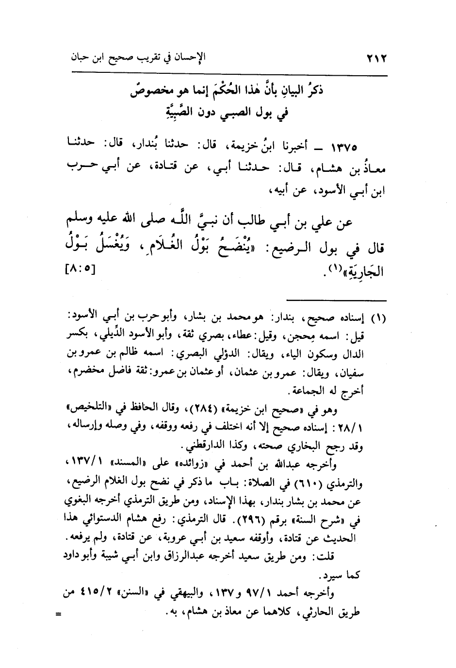 1375 - أَخْبَرَنَا ابْنُ خُزَيْمَةَ، قَالَ: حَدَّثَنَا بُنْدَارٌ، قَالَ: حَدَّثَنَا مُعَاذُ بْنُ هِشَامٍ، قَالَ: حَدَّثَنَا أَبِي، عَنْ قَتَادَةَ، عَنْ أَبِي حَرْبِ بْنِ أَبِي الْأَسْوَدِ، عَنْ أَبِيهِ، عَنْ عَلِيِّ بْنِ أَبِي طَالِبٍ، أَنَّ نَبِيَّ اللَّهِ صَلَّى اللَّهُ عَلَيْهِ وَسَلَّمَ قَالَ فِي بَوْلِ الرَّضِيعِ: «يُنْضَحُ بَوْلُ الْغُلَامِ، وَيُغْسَلُ بَوْلُ الْجَارِيَةِ» (¬1) . [5: 8]