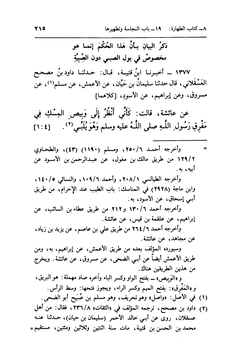 1377 - أَخْبَرَنَا ابْنُ قُتَيْبَةَ، قَالَ: حَدَّثَنَا دَاوُدُ بْنُ مُصَحِّحٍ الْعَسْقَلَانِيُّ، قَالَ: حَدَّثَنَا سُلَيْمَانُ بْنُ حَيَّانَ، عَنِ الْأَعْمَشِ، عَنْ مُسْلِمٍ (¬1) ، عَنْ مَسْرُوقٍ، وَعَنْ إِبْرَاهِيمَ، عَنِ الْأَسْوَدِ، [كِلَاهُمَا] ، عَنْ عَائِشَةَ، قَالَتْ: «كَأَنِّي أَنْظُرُ إِلَى وَبِيصِ الْمِسْكِ فِي مَفْرِقِ رَسُولِ اللَّهِ صَلَّى اللَّهُ عَلَيْهِ وَسَلَّمَ وَهُوَ يُلَبِّي» (¬2) . [4: 1]