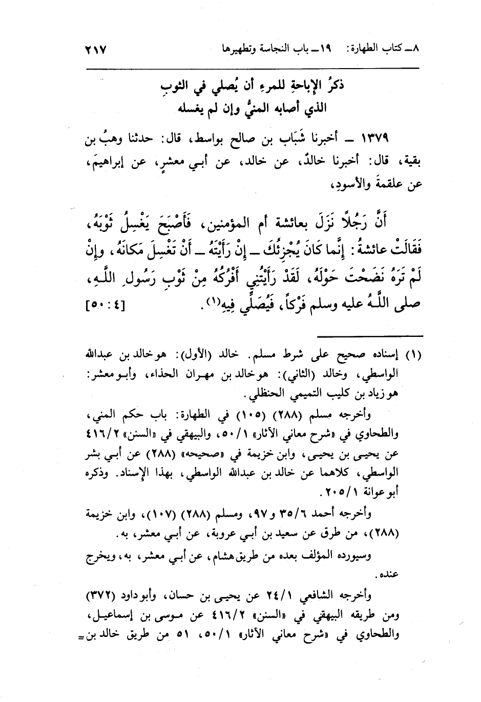 1379 - أَخْبَرَنَا شَبَابُ بْنُ صَالِحٍ، بِوَاسِطَ، قَالَ: حَدَّثَنَا وَهْبُ بْنُ بَقِيَّةَ، قَالَ: أَخْبَرَنَا خَالِدٌ، عَنْ خَالِدٍ، عَنْ أَبِي مَعْشَرٍ، عَنْ إِبْرَاهِيمَ، عَنْ عَلْقَمَةَ، وَالْأَسْوَدِ، أَنَّ رَجُلًا نَزَلَ بِعَائِشَةَ أُمِّ الْمُؤْمِنِينَ، فَأَصْبَحَ يَغْسِلُ ثَوْبَهُ، فَقَالَتْ عَائِشَةُ: «إِنَّمَا كَانَ يُجْزِيكَ - إِنْ رَأَيْتَهُ - أَنْ تَغْسِلَ مَكَانَهُ، وَإِنْ لَمْ تَرَهُ نَضَحْتَ حَوْلَهُ، لَقَدْ رَأَيْتُنِي أَفْرُكُهُ مِنْ ثَوْبِ رَسُولِ اللَّهِ صَلَّى اللَّهُ عَلَيْهِ وَسَلَّمَ فَرْكًا، فَيُصَلِّي فِيهِ» (¬1) . [4: 50]
