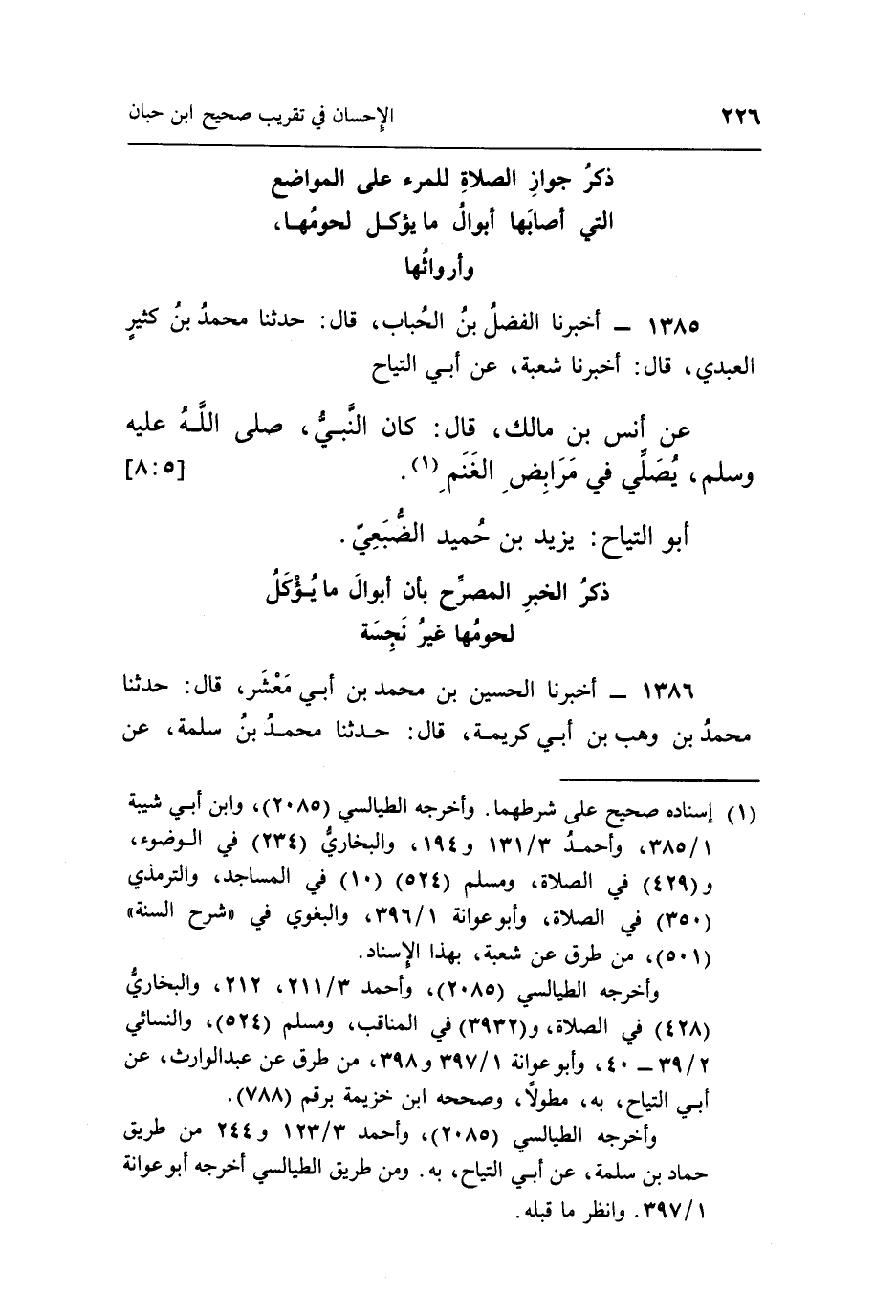 1385 - أَخْبَرَنَا الْفَضْلُ بْنُ الْحُبَابِ، قَالَ: حَدَّثَنَا مُحَمَّدُ بْنُ كَثِيرٍ الْعَبْدِيُّ، قَالَ: أَخْبَرَنَا شُعْبَةُ، عَنْ أَبِي التَّيَّاحِ، عَنْ أَنَسِ بْنِ مَالِكٍ، قَالَ: «كَانَ النَّبِيُّ صَلَّى اللَّهُ عَلَيْهِ وَسَلَّمَ يُصَلِّي فِي مَرَابِضِ الْغَنَمِ» (¬1) . [5: 8]