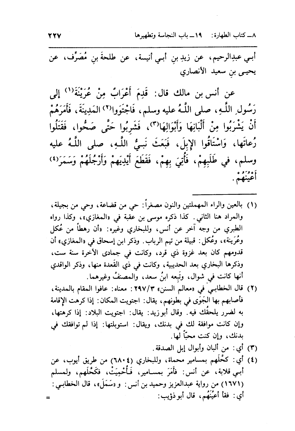 أَبِي عَبْدِ الرَّحِيمِ، عَنْ زَيْدِ بْنِ أَبِي أُنَيْسَةَ، عَنْ طَلْحَةَ بْنِ مُصَرِّفٍ، عَنْ يَحْيَى بْنِ سَعِيدٍ الْأَنْصَارِيِّ، عَنْ أَنَسِ بْنِ مَالِكٍ، قَالَ: قَدِمَ أَعْرَابٌ مِنْ عُرَيْنَةَ (¬1) إِلَى رَسُولِ اللَّهِ صَلَّى اللَّهُ عَلَيْهِ وَسَلَّمَ فَاجْتَوَوَا (¬2) الْمَدِينَةَ، «فَأَمَرَهُمْ أَنْ يَشْرَبُوا مِنْ أَلْبَانِهَا وَأَبْوَالِهَا (¬3) ، فَشَرِبُوا حَتَّى صَحُّوا، فَقَتَلُوا رُعَاتَهَا وَاسْتَاقُوا الْإِبِلَ، فَبَعَثَ نَبِيُّ اللَّهِ صَلَّى اللَّهُ عَلَيْهِ وَسَلَّمَ فِي طَلَبِهِمْ، فَأُتِيَ بِهِمْ، فَقَطَعَ أَيْدِيهِمْ وَأَرْجُلَهُمْ وَسَمَرَ (¬4) أَعْيُنَهُمْ»