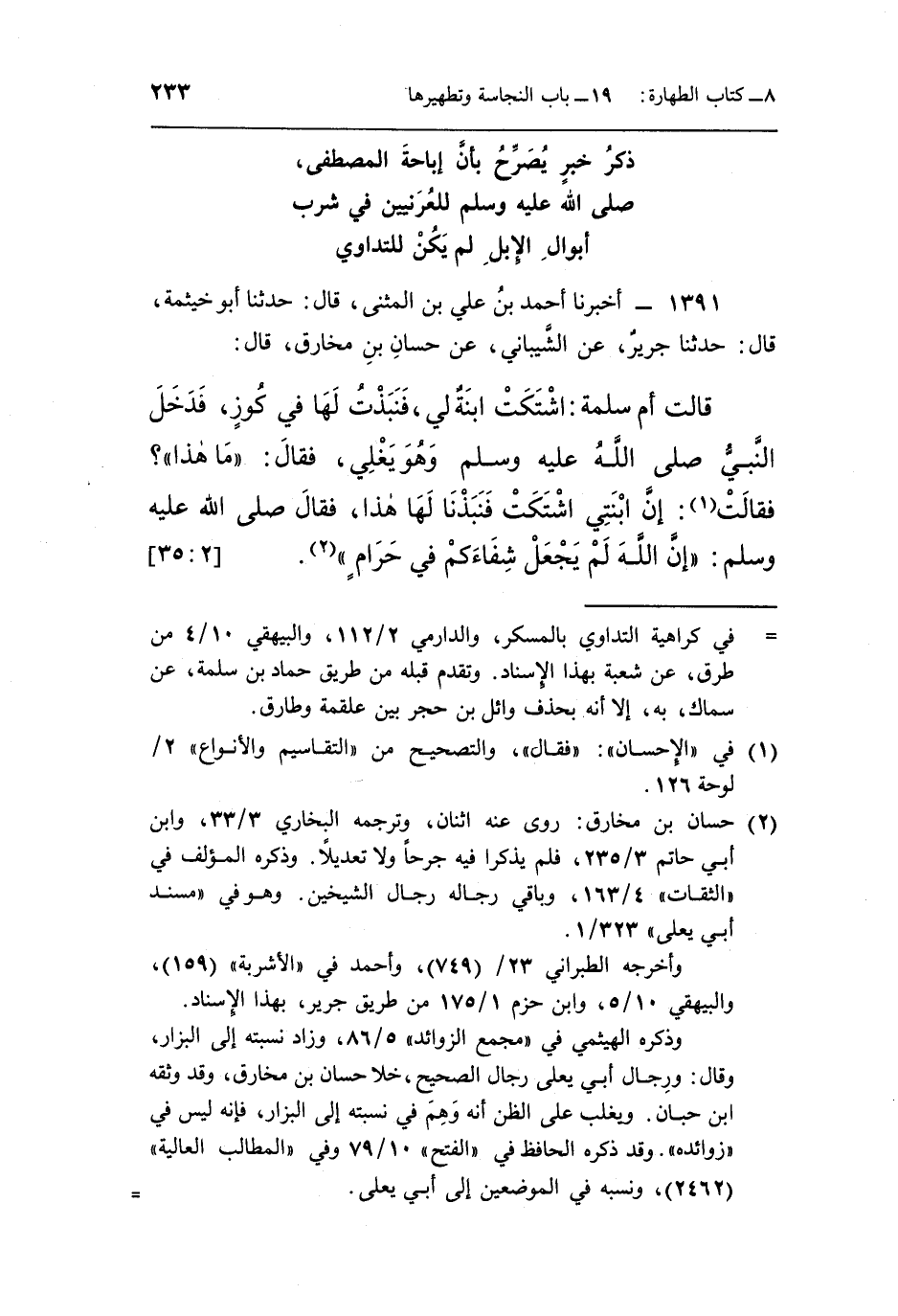 1391 - أَخْبَرَنَا أَحْمَدُ بْنُ عَلِيِّ بْنِ الْمُثَنَّى، قَالَ: حَدَّثَنَا أَبُو خَيْثَمَةَ، قَالَ: حَدَّثَنَا جَرِيرٌ، عَنِ الشَّيْبَانِيِّ، عَنْ حَسَّانَ بْنِ مُخَارِقٍ، قَالَ: قَالَتْ أُمُّ سَلَمَةَ اشْتَكَتِ ابْنَةٌ لِي، فَنَبَذْتُ لَهَا فِي كُوزٍ، فَدَخَلَ النَّبِيُّ صَلَّى اللَّهُ عَلَيْهِ وَسَلَّمَ، وَهُوَ يَغْلِي، فَقَالَ «مَا هَذَا؟» فَقَالَتْ (¬1) : إِنَّ ابْنَتِي اشْتَكَتْ فَنَبَذْنَا لَهَا هَذَا، فَقَالَ صَلَّى اللَّهُ عَلَيْهِ وَسَلَّمَ: «إِنَّ اللَّهَ لَمْ يَجْعَلْ شِفَاءَكُمْ فِي حَرَامٍ» (¬2) . [2: 35]