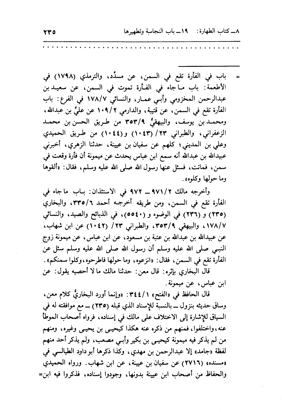= باب في الفأرة تقع في السمن، عن مسدَّد، والترمذي (1798) في الأطعمة: باب ما جاء في الفأرة تموت في السمن، عن سعيد بن عبد الرحمن المخزومي وأبي عمار، والنسائي 7/178 في الفرع: باب الفأرة تقع في السمن، عن قتيبة، والدارمي 2/109 عن عليّ بن عبد الله، ومحمد بن يوسف، والبيهقي 9/353 من طريق الحسن بن محمد الزعفراني، والطبراني 23/ (1043) و (1044) من طريق الحميدي وعلي بن المديني؛ كلهم عن سفيان بن عيينة، حدثنا الزهري، أخبرني عبيد الله بن عبد الله أنه سمع ابن عباس يحدث عن ميمونة أن فأرة وقعت في سمن، فماتت، فسئل عنها رسول الله - صلى الله عليه وسلم -، فقال: " ألقوها وما حولها وكلوه ".