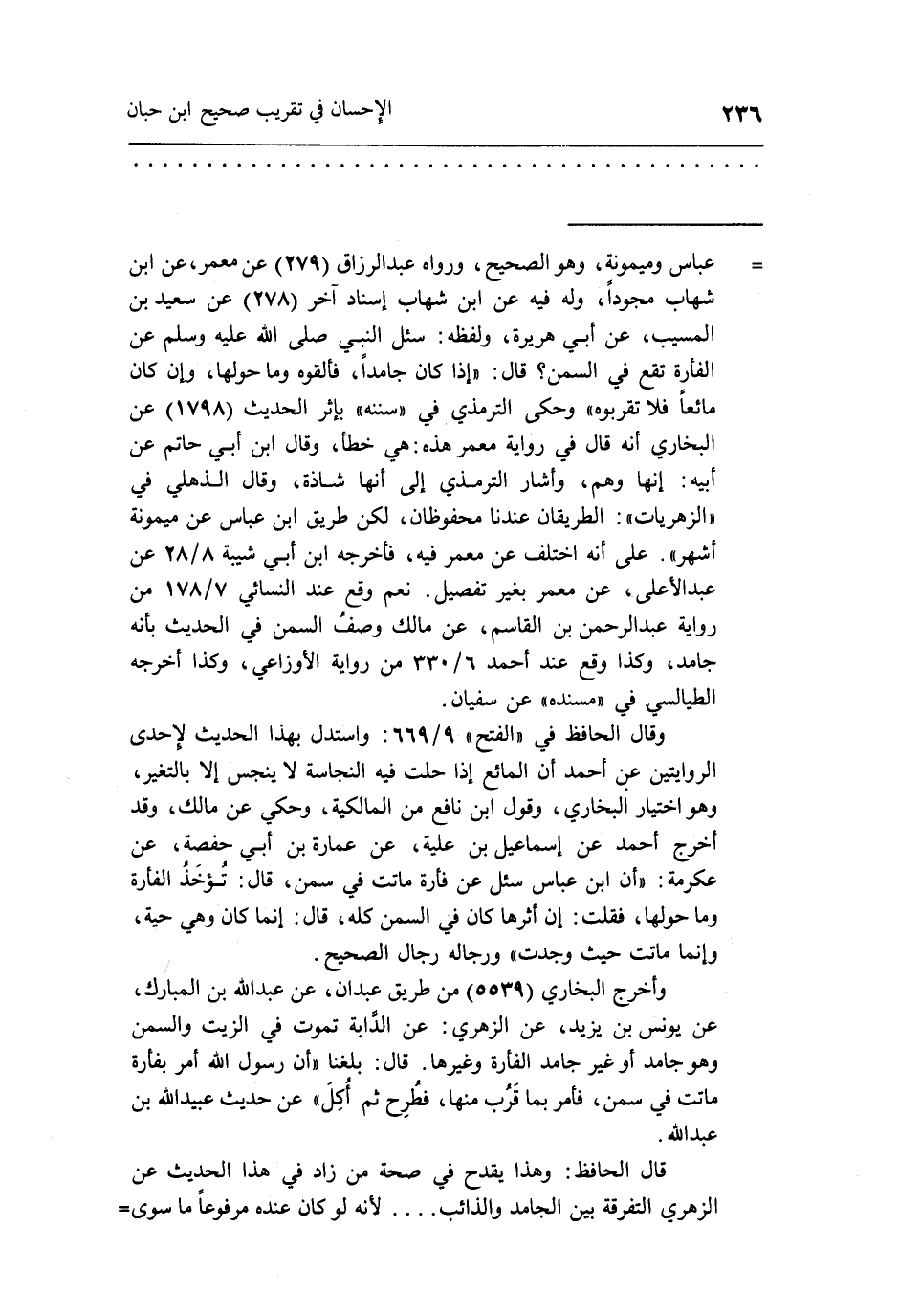 = عباس وميمونة، وهو الصحيح، ورواه عبد الرزاق (279) عن معمر، عن ابن شهاب مجوداً، وله فيه عن ابن شهاب إسناد آخر (278) عن سعيد بن المسيب، عن أبي هريرة، ولفظه: سئل النبي صلى الله عليه وسلم عن الفأرة تقع في السمن؟ قال: " إذا كان جامداً، فألقوه وما حولها، وإن كان مائعاً فلا تقربوه " وحكى الترمذي في " سننه " بإثر الحديث (1798) عن البخاري أنه قال في رواية معمر هذه: هي خطأ، وقال ابن أبي حاتم عن أبيه: إنها وهم، وأشار الترمذي إلى أنها شاذة، وقال الذهلي في " الزهريات ": الطريقان عندنا محفوظان، لكن طريق ابن عباس عن ميمونة أشهر ". على أنه اختلف عن معمر فيه، فأخرجه ابن أبي شيبة 8/28 عن عبد الأعلى، عن معمر بغير تفصيل. نعم وقع عند النسائي 7/178 من رواية عبد الرحمن بن القاسم، عن مالك وصفُ السمن في الحديث بأنه جامد، وكذا وقع عند أحمد 6/330 من رواية الأوزاعي، وكذا أخرجه الطيالسي في " مسنده " عن سفيان.