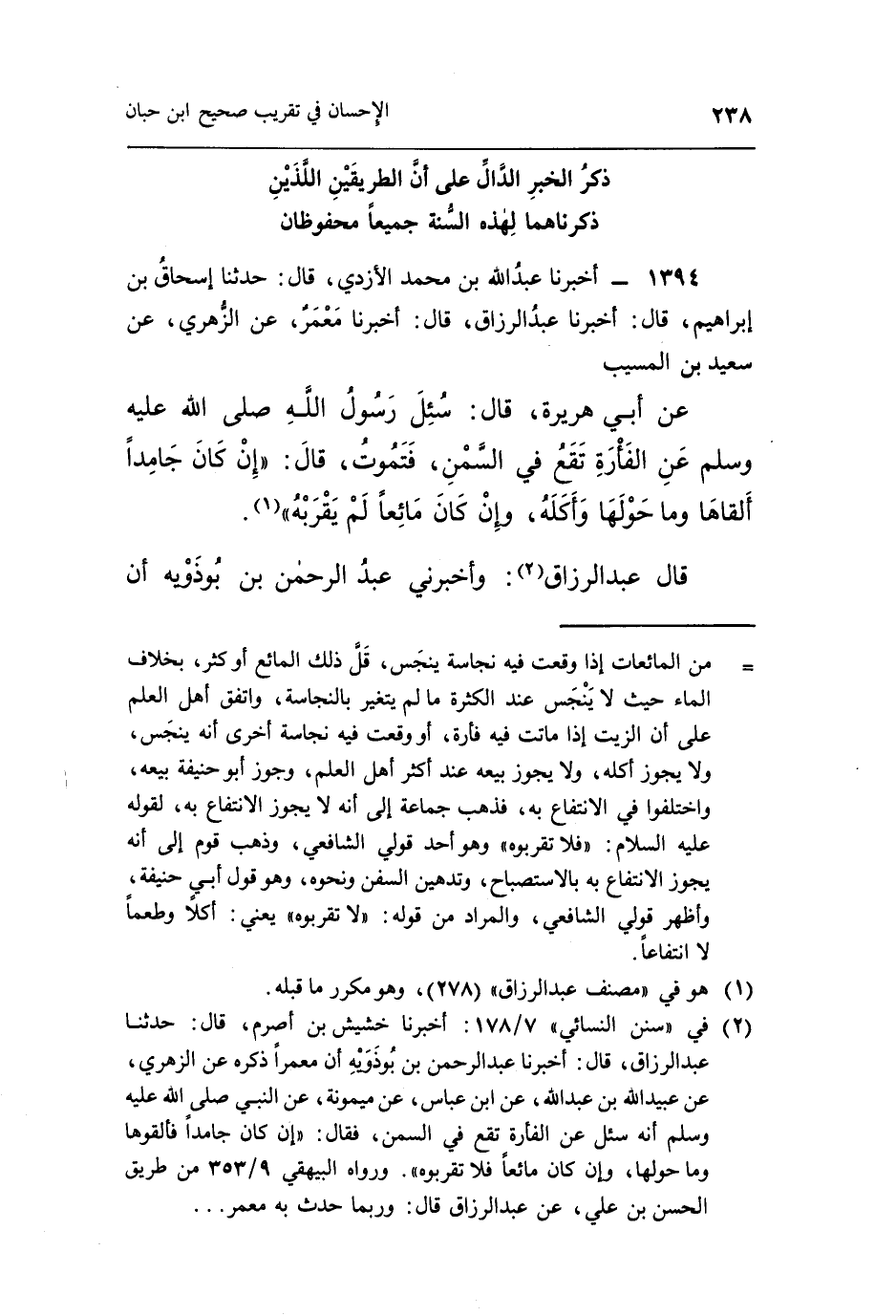 1394 - أَخْبَرَنَا عَبْدُ اللَّهِ بْنُ مُحَمَّدٍ الْأَزْدِيُّ، قَالَ: حَدَّثَنَا إِسْحَاقُ بْنُ إِبْرَاهِيمَ، قَالَ: أَخْبَرَنَا عَبْدُ الرَّزَّاقِ، قَالَ: أَخْبَرَنَا مَعْمَرٌ، عَنِ الزُّهْرِيِّ، عَنْ سَعِيدِ بْنِ الْمُسَيِّبِ، عَنْ أَبِي هُرَيْرَةَ، قَالَ: سُئِلَ رَسُولُ اللَّهِ صَلَّى اللَّهُ عَلَيْهِ وَسَلَّمَ عَنِ الْفَأْرَةِ تَقَعُ فِي السَّمْنِ، فَتَمُوتُ، قَالَ: «إِنْ كَانَ جَامِدًا أَلْقَاهَا وَمَا حَوْلَهَا وَأَكَلَهُ، وَإِنْ كَانَ مَائِعًا لَمْ يَقْرَبْهُ» (¬1) .