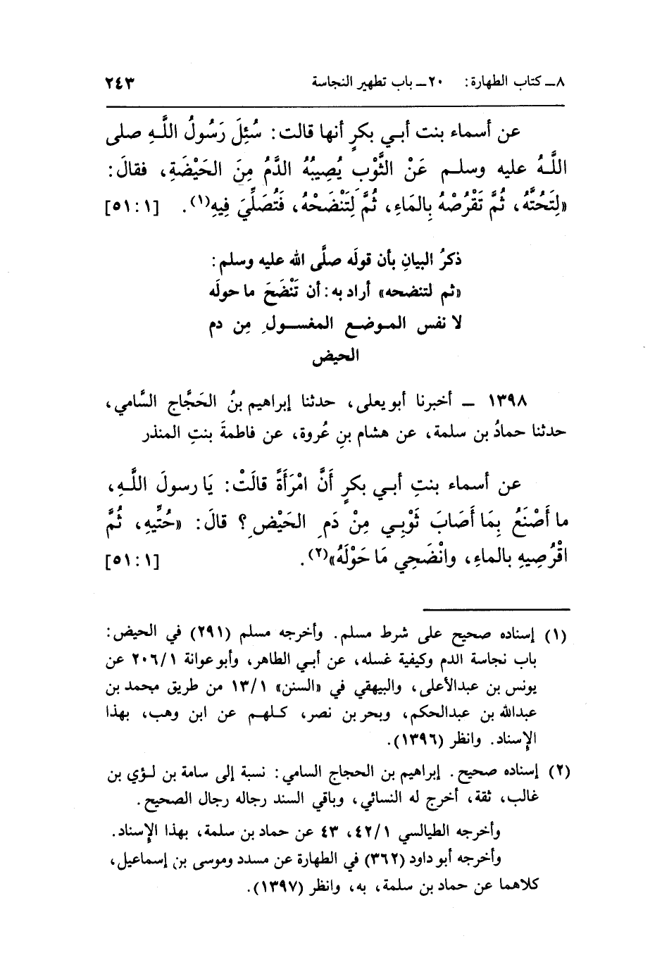 1398 - أَخْبَرَنَا أَبُو يَعْلَى، حَدَّثَنَا إِبْرَاهِيمُ بْنُ الْحَجَّاجِ السَّامِيُّ، حَدَّثَنَا حَمَّادُ بْنُ سَلَمَةَ، عَنْ هِشَامِ بْنِ عُرْوَةَ، عَنْ فَاطِمَةَ بِنْتِ الْمُنْذِرِ، عَنْ أَسْمَاءَ بِنْتِ أَبِي بَكْرٍ، أَنَّ امْرَأَةً، قَالَتْ: يَا رَسُولِ اللَّهِ، مَا أَصْنَعُ بِمَا أَصَابَ ثَوْبِي مِنْ دَمِ الْحَيْضِ؟ قَالَ: «حُتِّيهِ، ثُمَّ اقْرُصِيهِ بِالْمَاءِ، وَانْضَحِي مَا حَوْلَهُ» (¬2) . [1: 51]