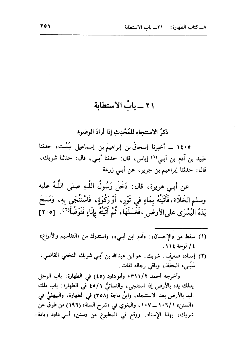 1405 - أَخْبَرَنَا إِسْحَاقُ بْنُ إِبْرَاهِيمَ بْنِ إِسْمَاعِيلَ، بِبُسْتَ، حَدَّثَنَا عُبَيْدُ بْنُ آدَمَ بْنِ أَبِي (¬1) إِيَاسٍ، قَالَ: حَدَّثَنَا أَبِي، قَالَ: حَدَّثَنَا شَرِيكٌ، قَالَ: حَدَّثَنَا إِبْرَاهِيمُ بْنُ جَرِيرٍ، عَنْ أَبِي زُرْعَةَ، عَنْ أَبِي هُرَيْرَةَ، قَالَ: «دَخَلَ رَسُولُ اللَّهِ صَلَّى اللَّهُ عَلَيْهِ وَسَلَّمَ الْخَلَاءَ، فَأَتَيْتُهُ بِمَاءٍ فِي تَوْرٍ أَوْ رَكْوَةٍ، فَاسْتَنْجَى بِهِ، وَمَسَحَ يَدَهُ الْيُسْرَى عَلَى الْأَرْضِ، فَغَسَلَهَا، ثُمَّ أَتَيْتُهُ بِإِنَاءٍ فَتَوَضَّأَ» (¬2) . [5: 2]